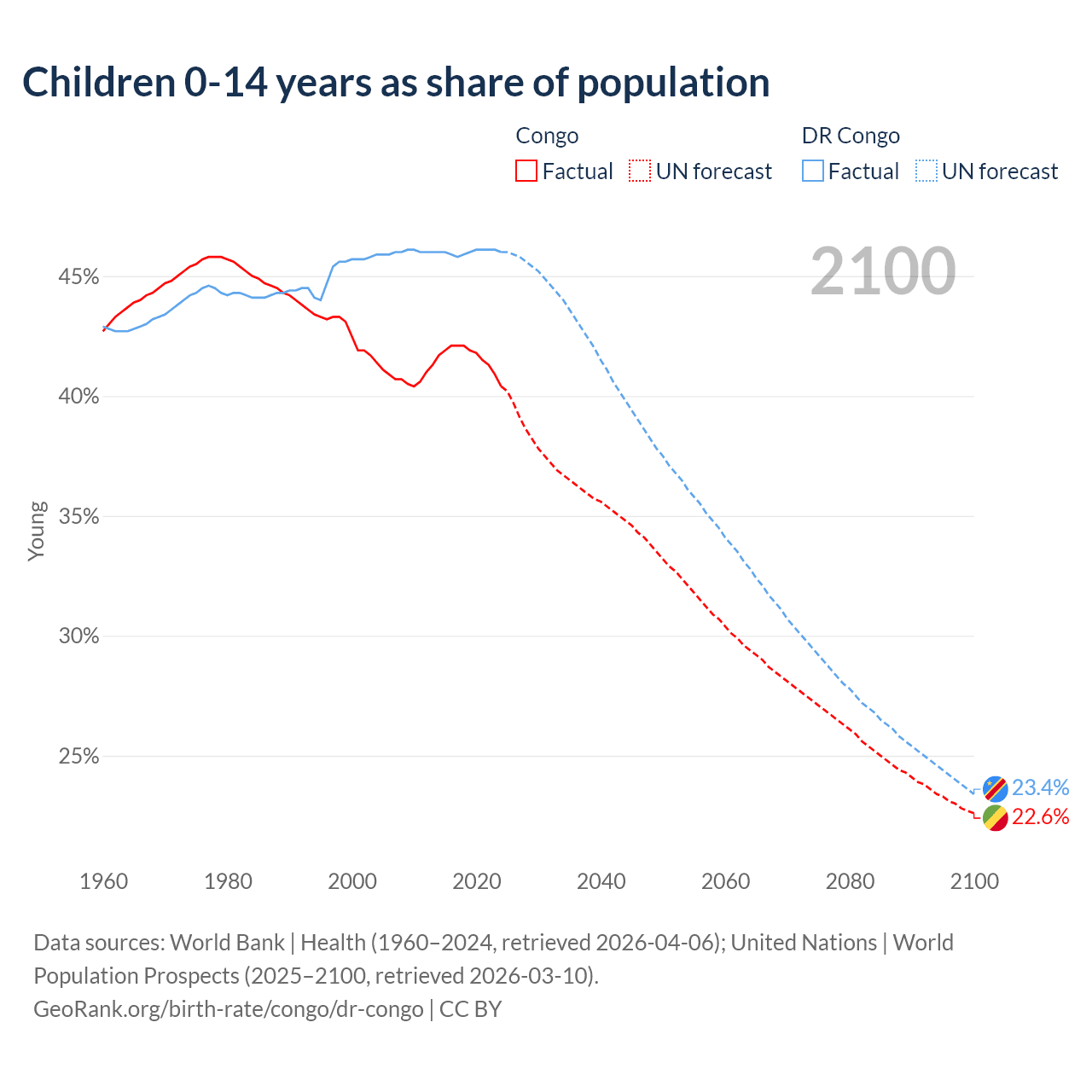 1960 vs 2023, the fertility rate has decreased by 31.7% in the Congo and by 0.88% in the DR Congo — in 1960, it was 6.09 and 6.11, respectively.