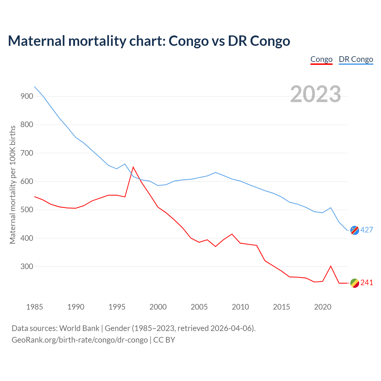 The maternal mortality rate, which is the probability of dying during childbirth or within 42 days of pregnancy termination, is 241 deaths per 100,000 live births in the Congo, compared to 427 deaths in the DR Congo.