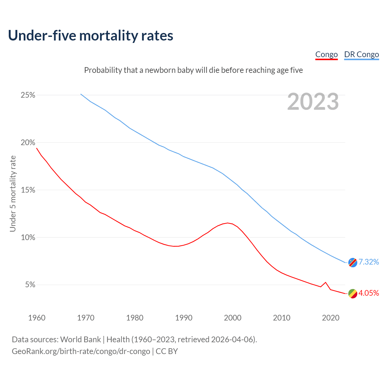 The chance that a newborn baby will die before reaching age five is 4.05% in the Congo and 7.32% in the DR Congo. Above is a chart with historical data on under-five mortality rates.