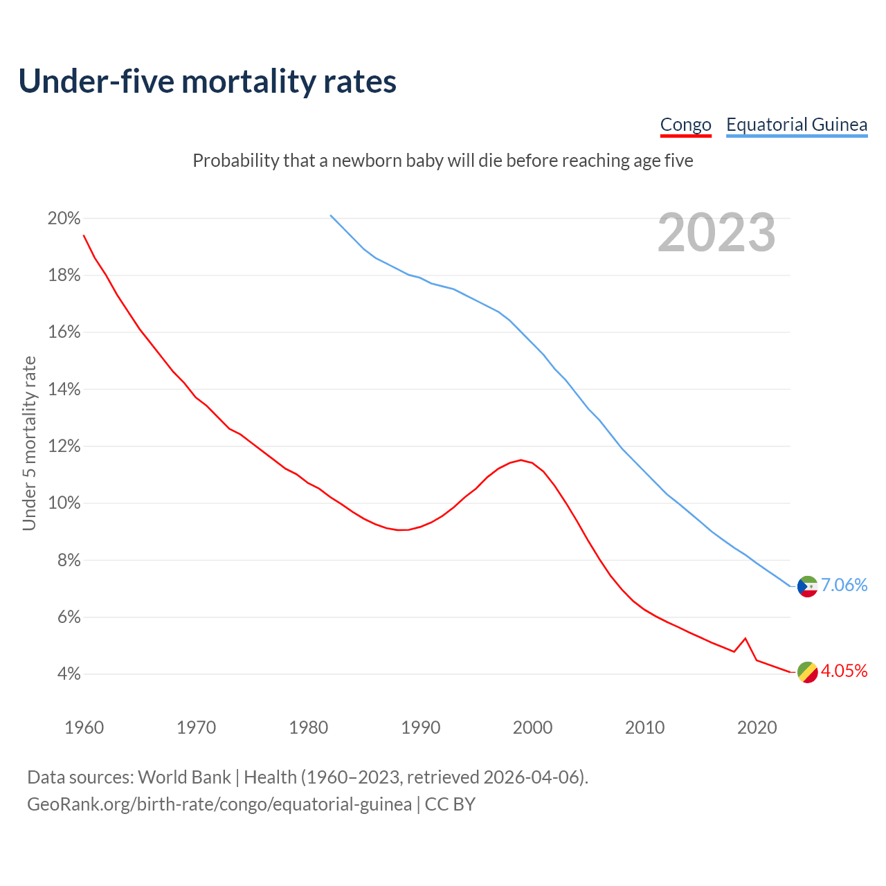 The chance that a newborn baby will die before reaching age five is 4.05% in the Congo and 7.06% in Equatorial Guinea. Above is a chart with historical data on under-five mortality rates.