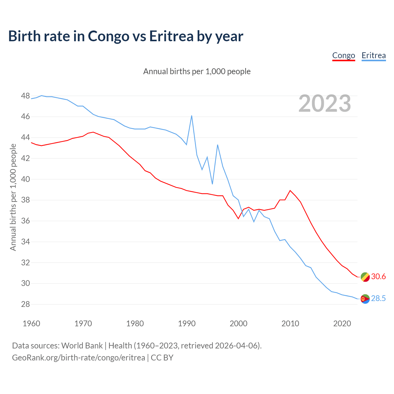 The Congo has an annual birth rate of 30.6 births per 1,000 people, compared to 28.5 for Eritrea. The average number of children a woman is expected to have during her lifetime — the fertility rate, is 4.16 in the Congo and 3.71 in Eritrea — 10.7% difference.