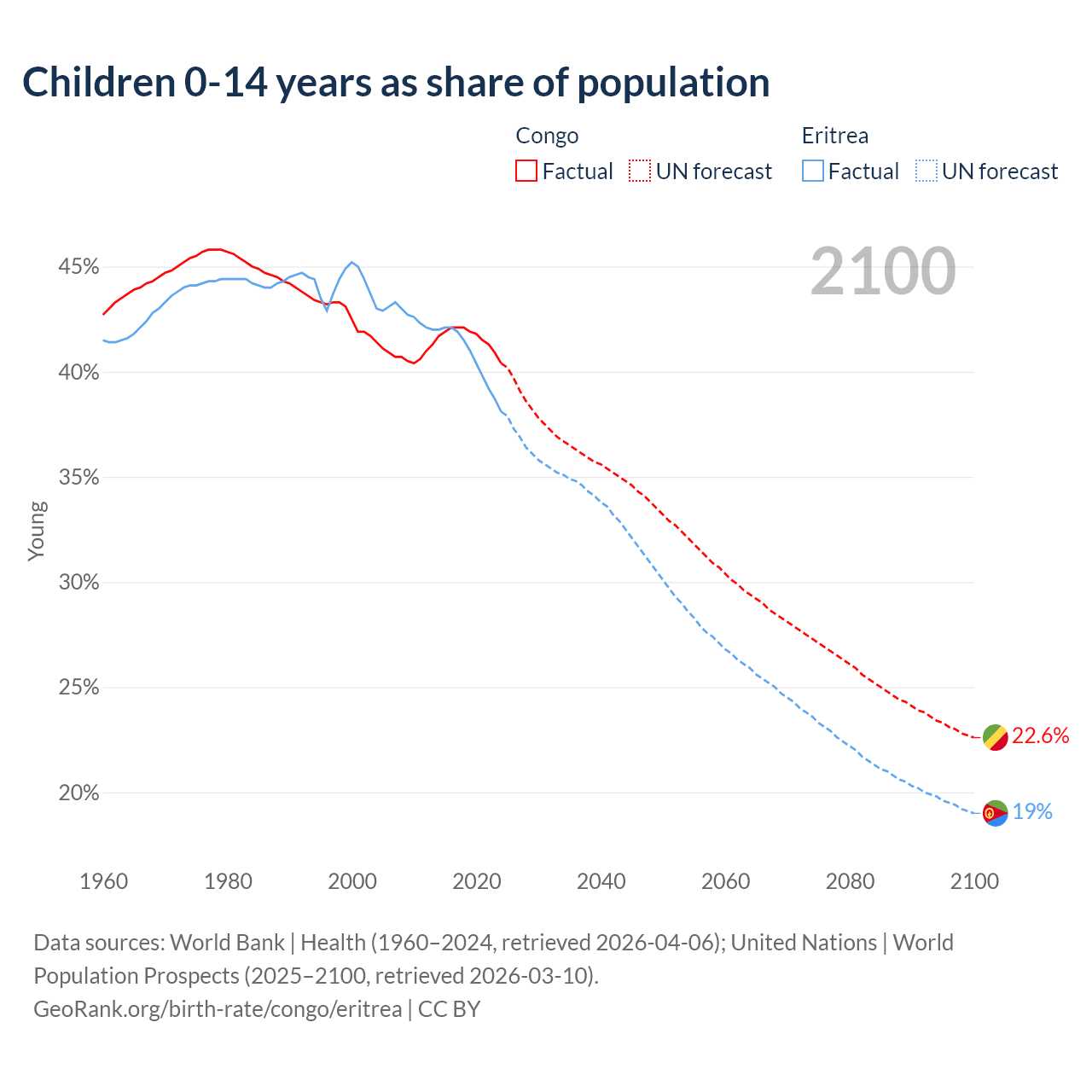 According to the latest available data on birth rates, the fertility rate in the Congo was 4.16 children per woman in 2023, compared to 3.71 in Eritrea in 2023. The replacement level is considered to be 2.1 children per woman.