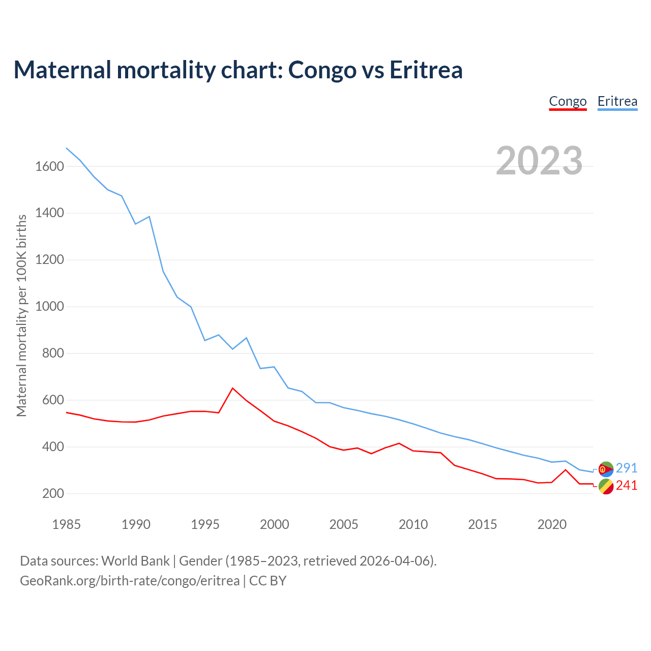 The maternal mortality rate, which is the probability of dying during childbirth or within 42 days of pregnancy termination, is 241 deaths per 100,000 live births in the Congo, compared to 291 deaths in Eritrea.