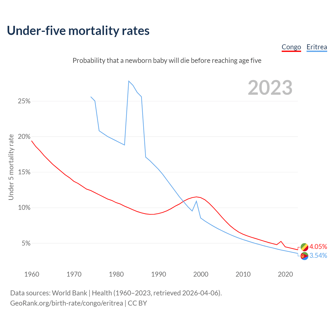 The chance that a newborn baby will die before reaching age five is 4.05% in the Congo and 3.54% in Eritrea. Above is a chart with historical data on under-five mortality rates.
