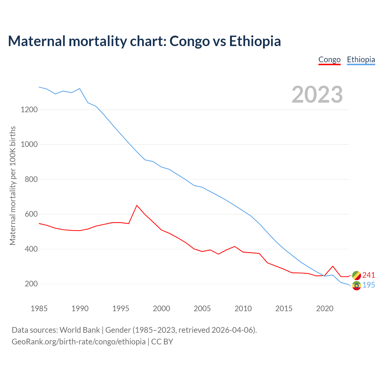 The maternal mortality rate, which is the probability of dying during childbirth or within 42 days of pregnancy termination, is 241 deaths per 100,000 live births in the Congo, compared to 195 deaths in Ethiopia.