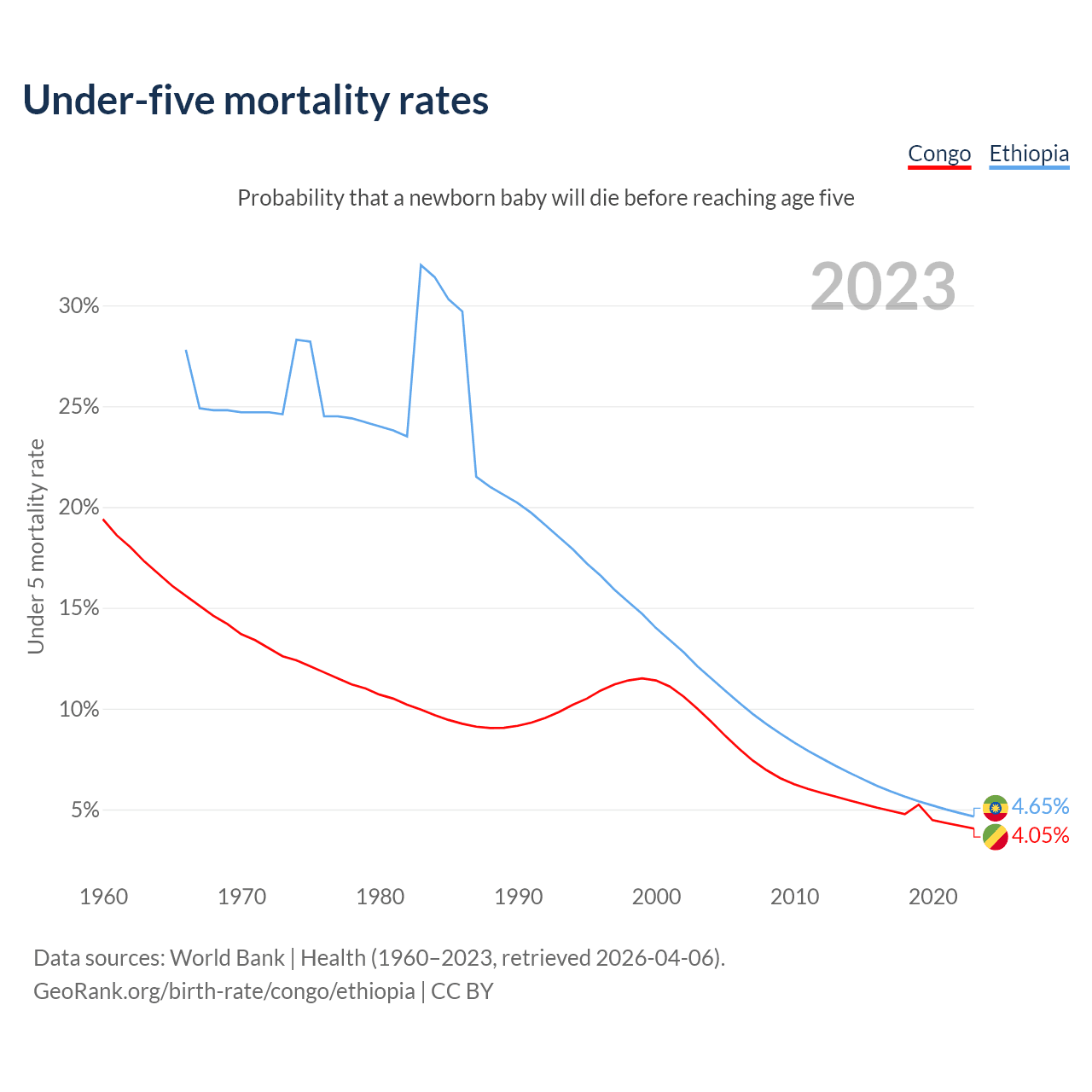 The chance that a newborn baby will die before reaching age five is 4.05% in the Congo and 4.65% in Ethiopia. Above is a chart with historical data on under-five mortality rates.