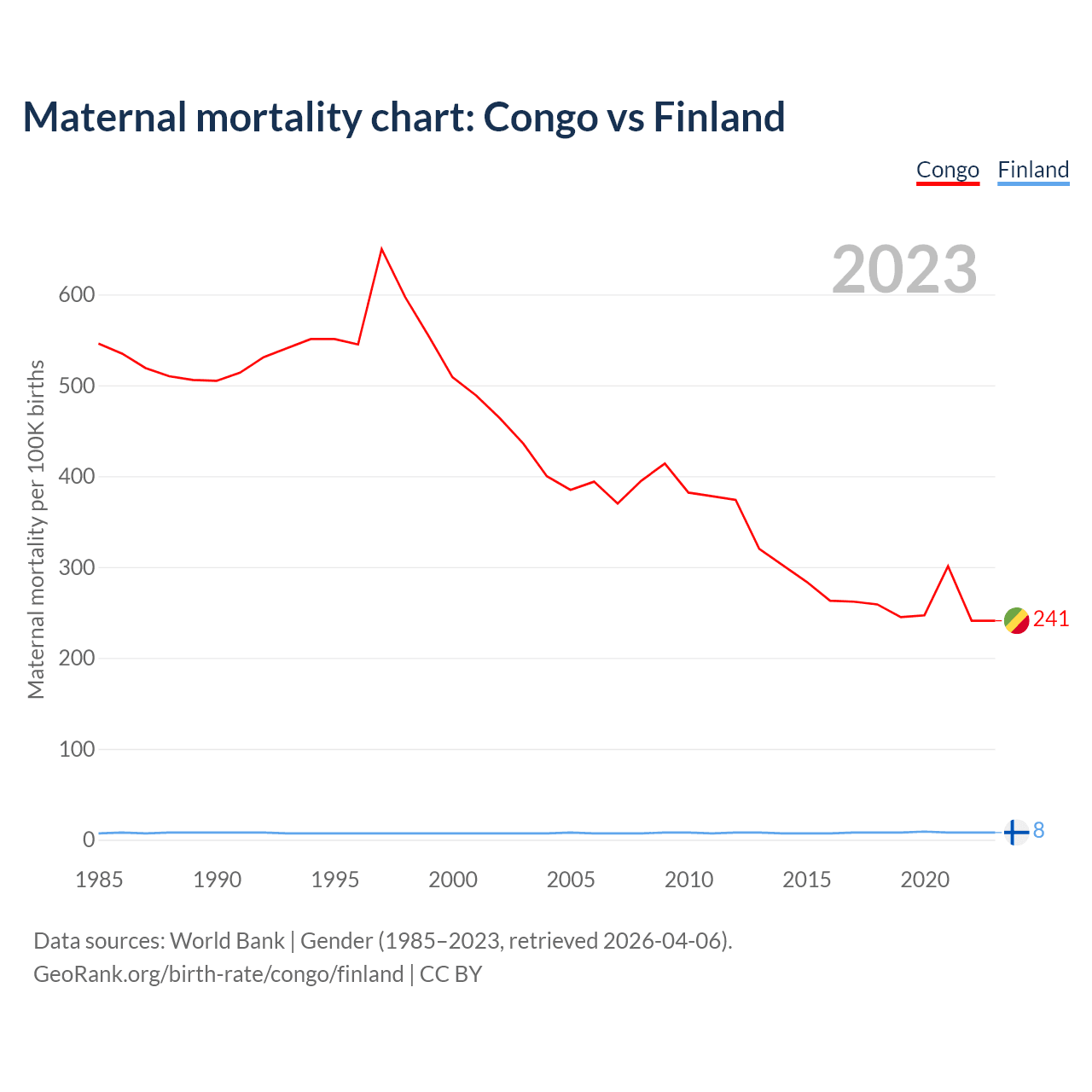 The maternal mortality rate, which is the probability of dying during childbirth or within 42 days of pregnancy termination, is 241 deaths per 100,000 live births in the Congo, compared to 8 deaths in Finland.