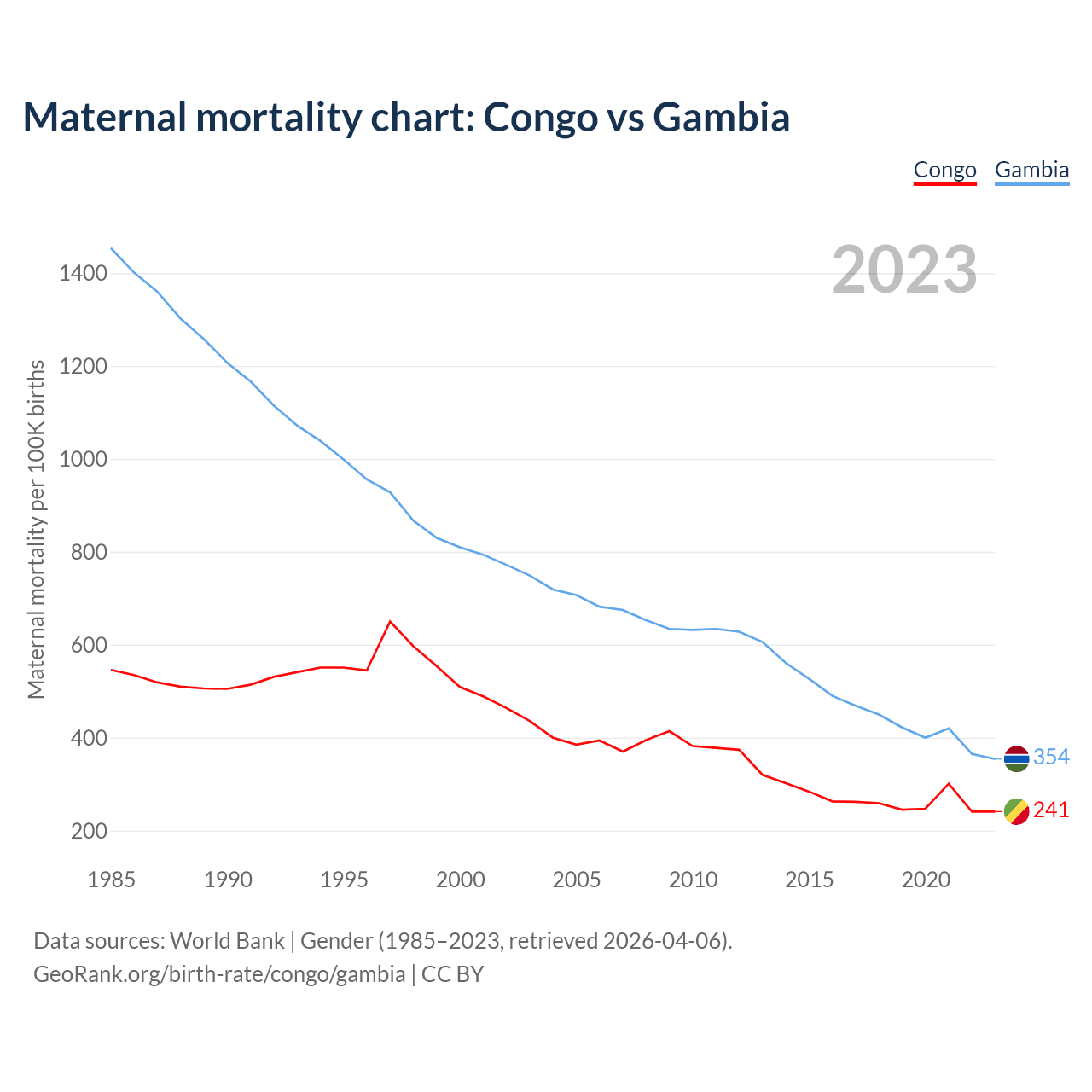 The maternal mortality rate, which is the probability of dying during childbirth or within 42 days of pregnancy termination, is 241 deaths per 100,000 live births in the Congo, compared to 354 deaths in the Gambia.