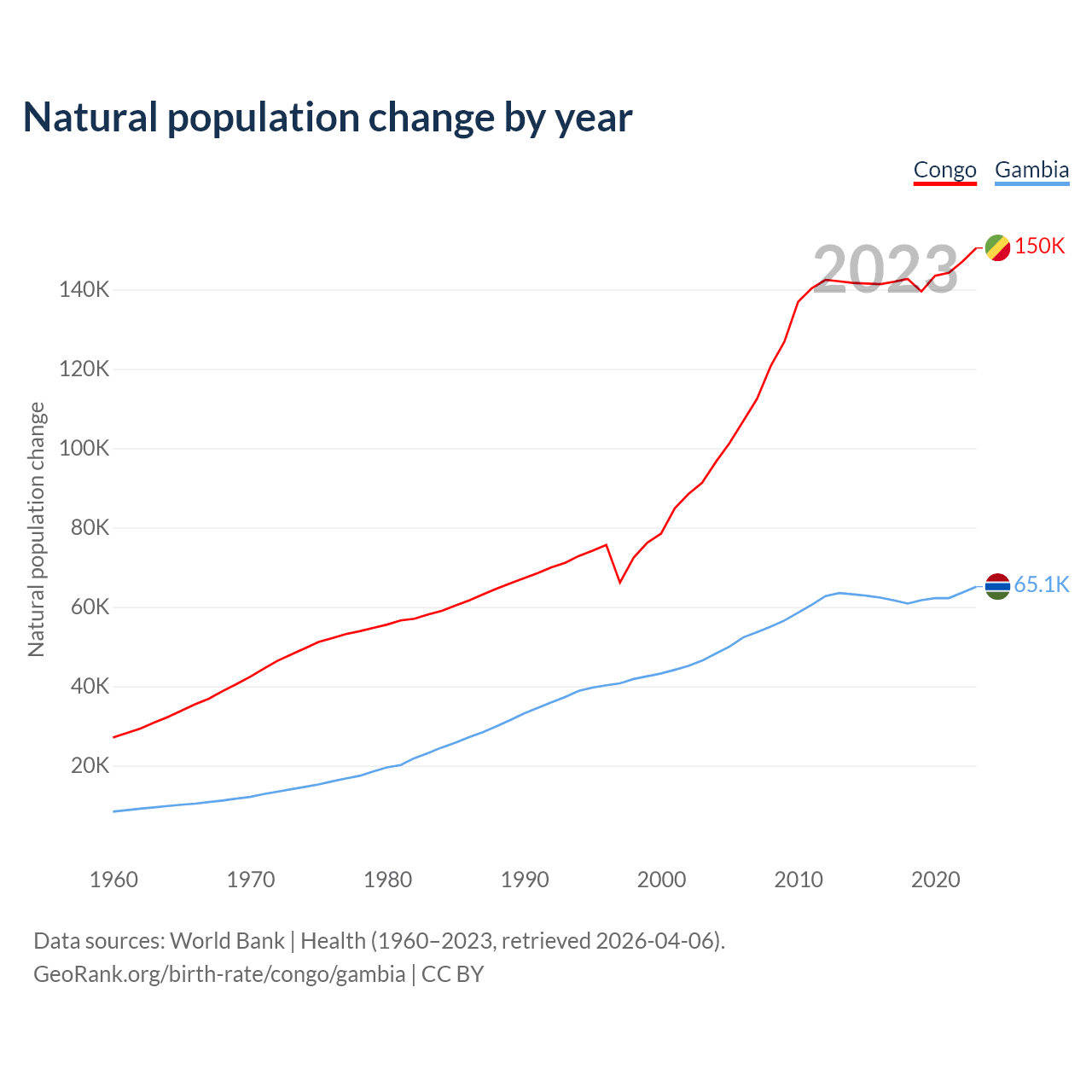The Congo has an annual birth rate of 30.6 births per 1,000 people, compared to 30.4 for the Gambia. The average number of children a woman is expected to have during her lifetime — the fertility rate, is 4.16 in the Congo and 4.01 in the Gambia — 3.63% difference.