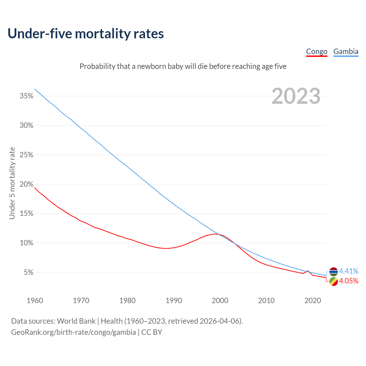 The chance that a newborn baby will die before reaching age five is 4.05% in the Congo and 4.41% in the Gambia. Above is a chart with historical data on under-five mortality rates.