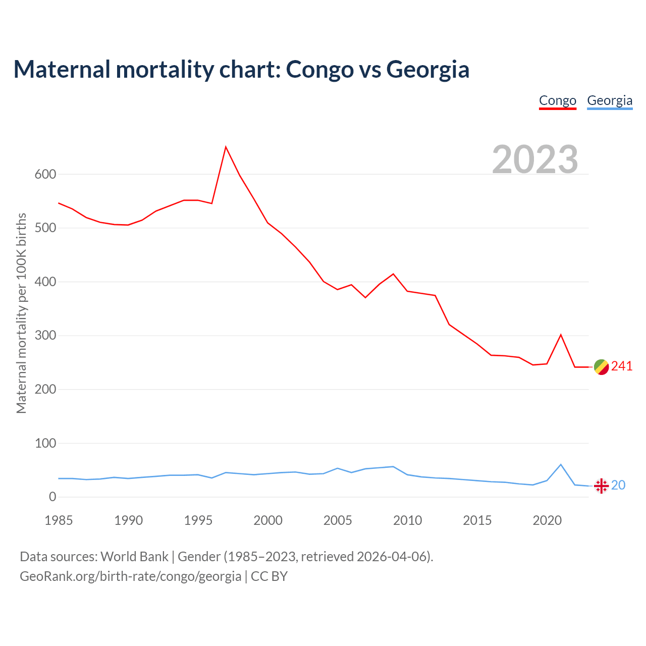 The maternal mortality rate, which is the probability of dying during childbirth or within 42 days of pregnancy termination, is 241 deaths per 100,000 live births in the Congo, compared to 20 deaths in Georgia.