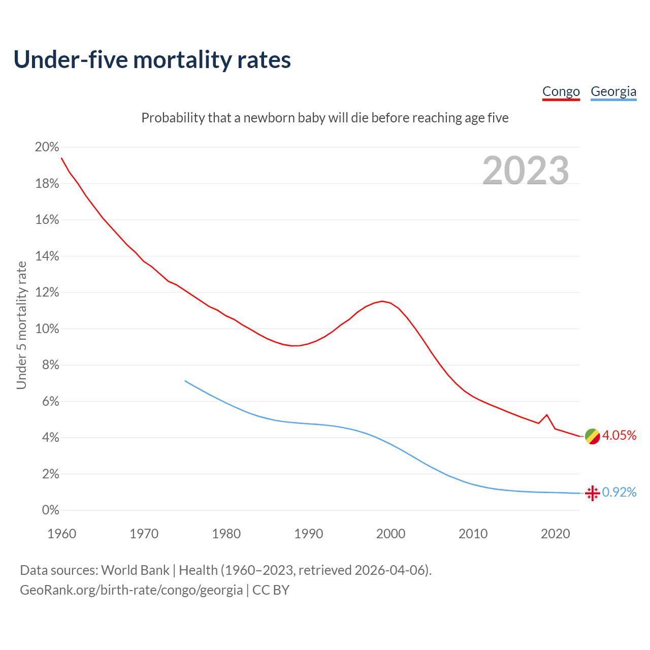 The chance that a newborn baby will die before reaching age five is 4.05% in the Congo and 0.92% in Georgia. Above is a chart with historical data on under-five mortality rates.