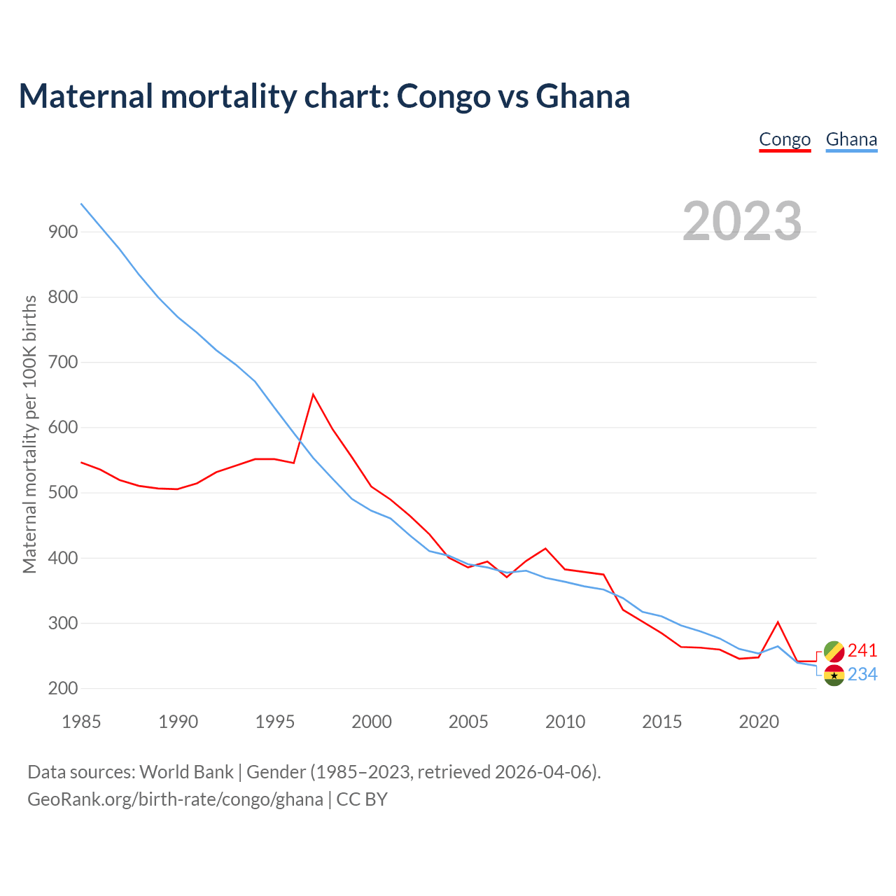 The maternal mortality rate, which is the probability of dying during childbirth or within 42 days of pregnancy termination, is 241 deaths per 100,000 live births in the Congo, compared to 234 deaths in Ghana.