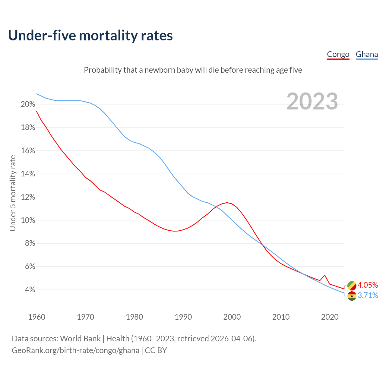 The chance that a newborn baby will die before reaching age five is 4.05% in the Congo and 3.71% in Ghana. Above is a chart with historical data on under-five mortality rates.