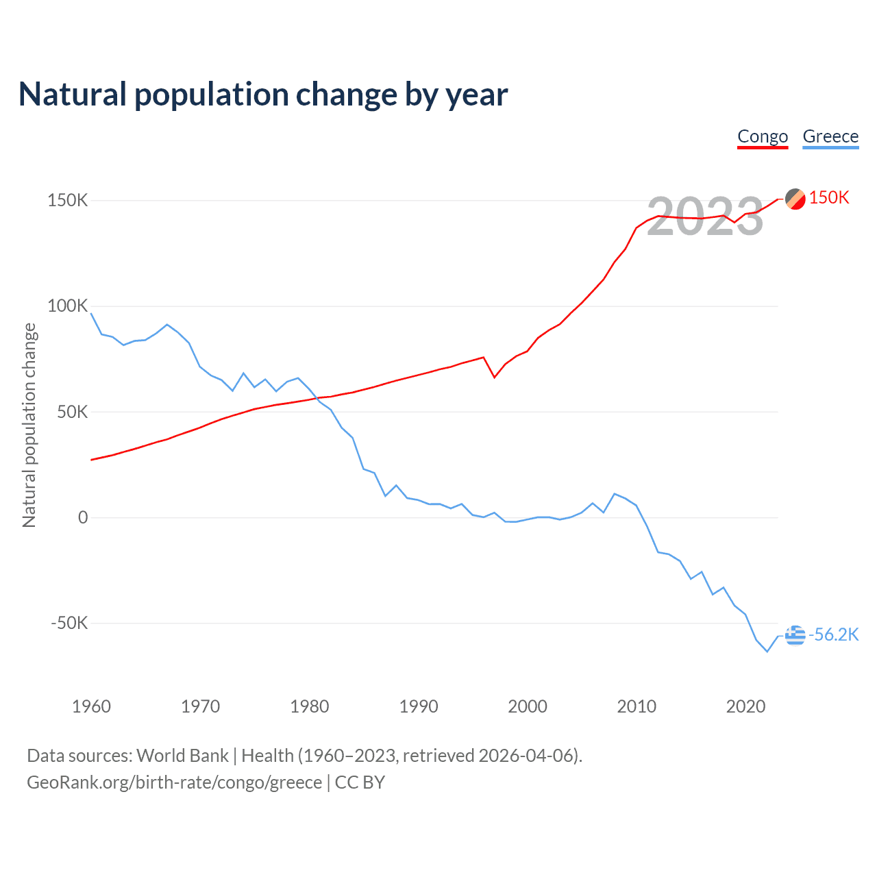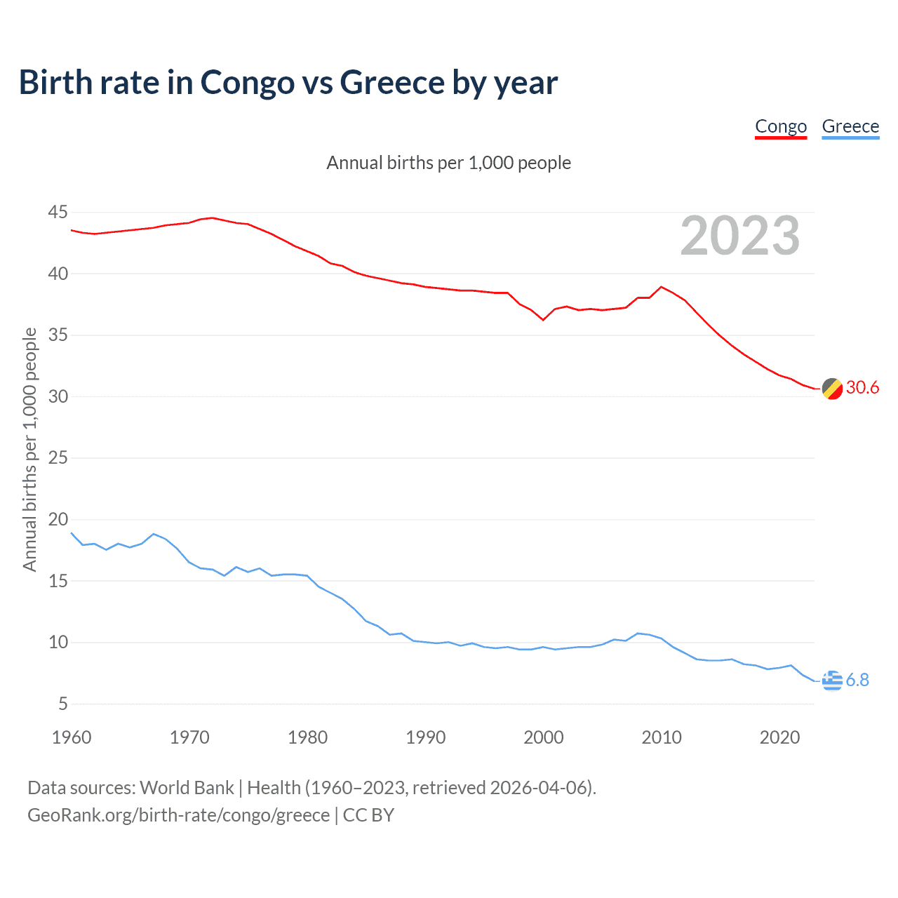 The Congo has an annual birth rate of 30.6 births per 1,000 people, compared to 6.8 for Greece. The average number of children a woman is expected to have during her lifetime — the fertility rate, is 4.16 in the Congo and 1.32 in Greece — 68.2% difference.