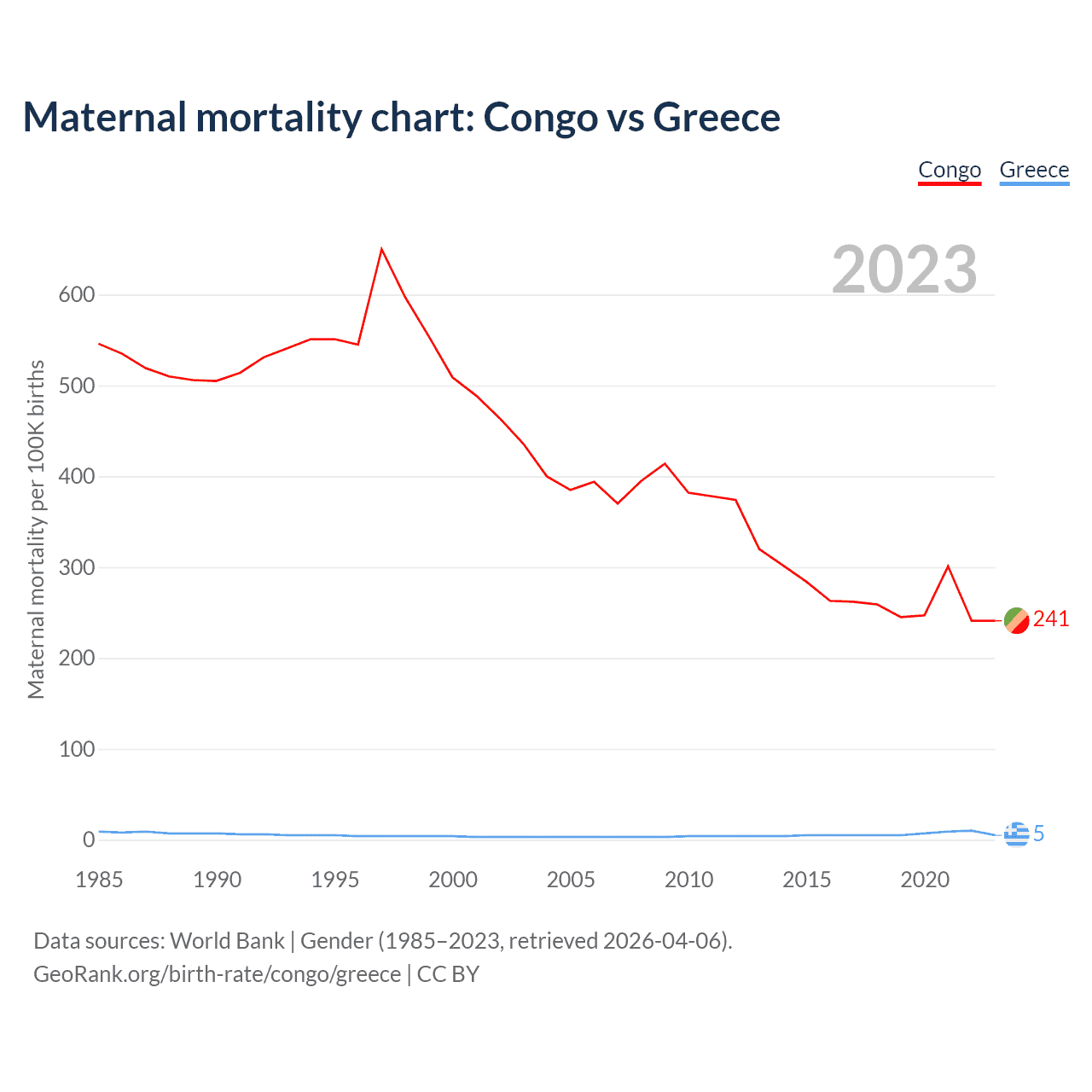 The maternal mortality rate, which is the probability of dying during childbirth or within 42 days of pregnancy termination, is 241 deaths per 100,000 live births in the Congo, compared to 5 deaths in Greece.