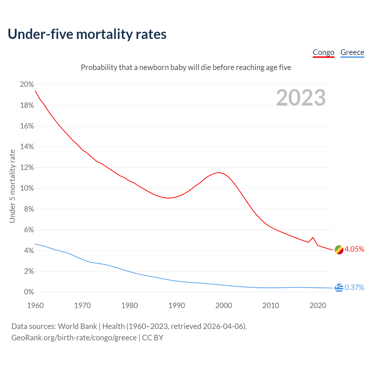 The chance that a newborn baby will die before reaching age five is 4.05% in the Congo and 0.37% in Greece. Above is a chart with historical data on under-five mortality rates.