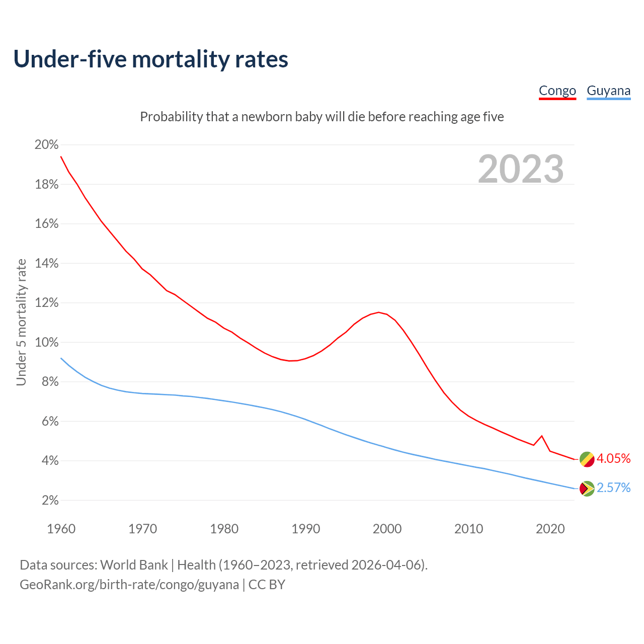 The chance that a newborn baby will die before reaching age five is 4.05% in the Congo and 2.57% in Guyana. Above is a chart with historical data on under-five mortality rates.