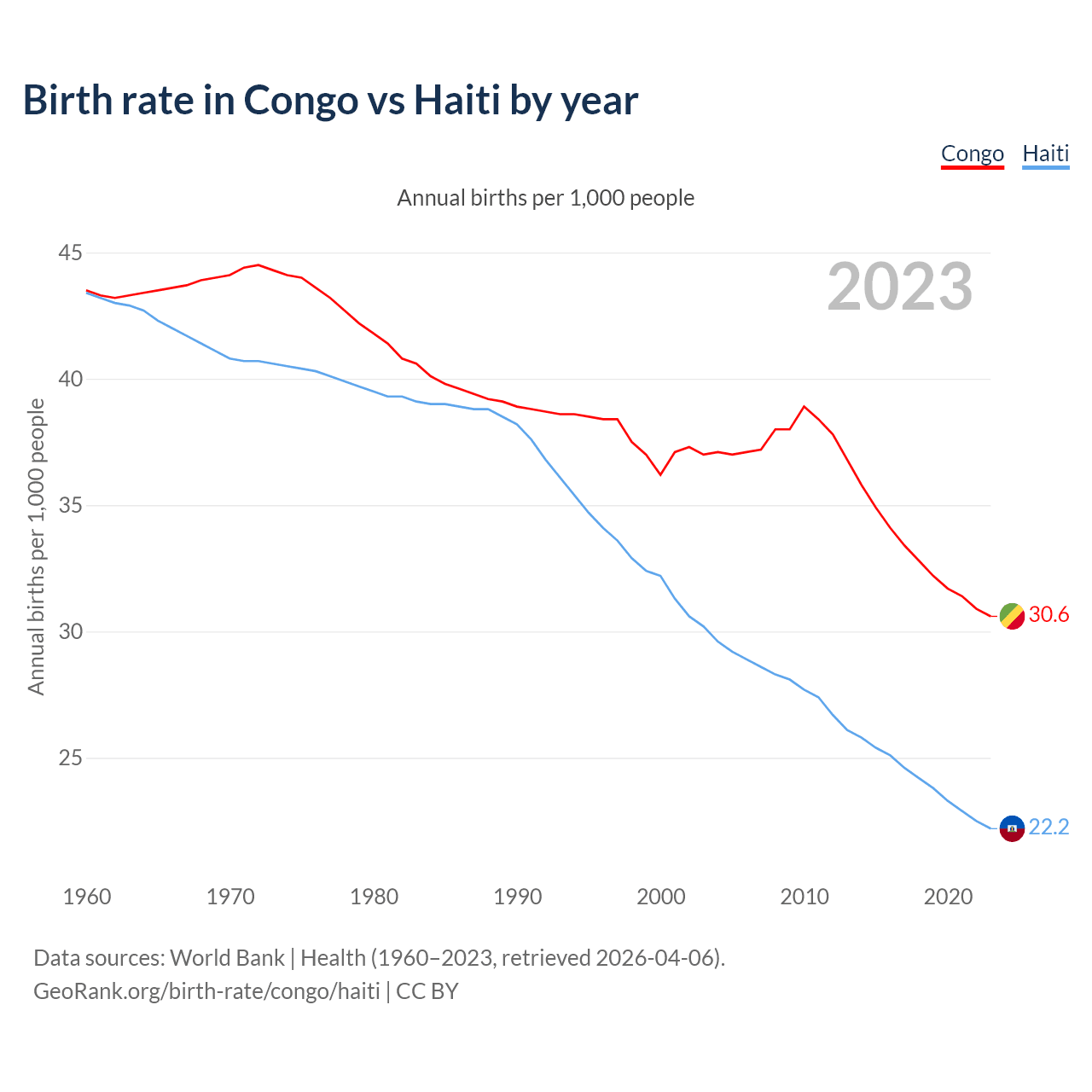 The Congo has an annual birth rate of 30.6 births per 1,000 people, compared to 22.2 for Haiti. The average number of children a woman is expected to have during her lifetime — the fertility rate, is 4.16 in the Congo and 2.66 in Haiti — 36.1% difference.