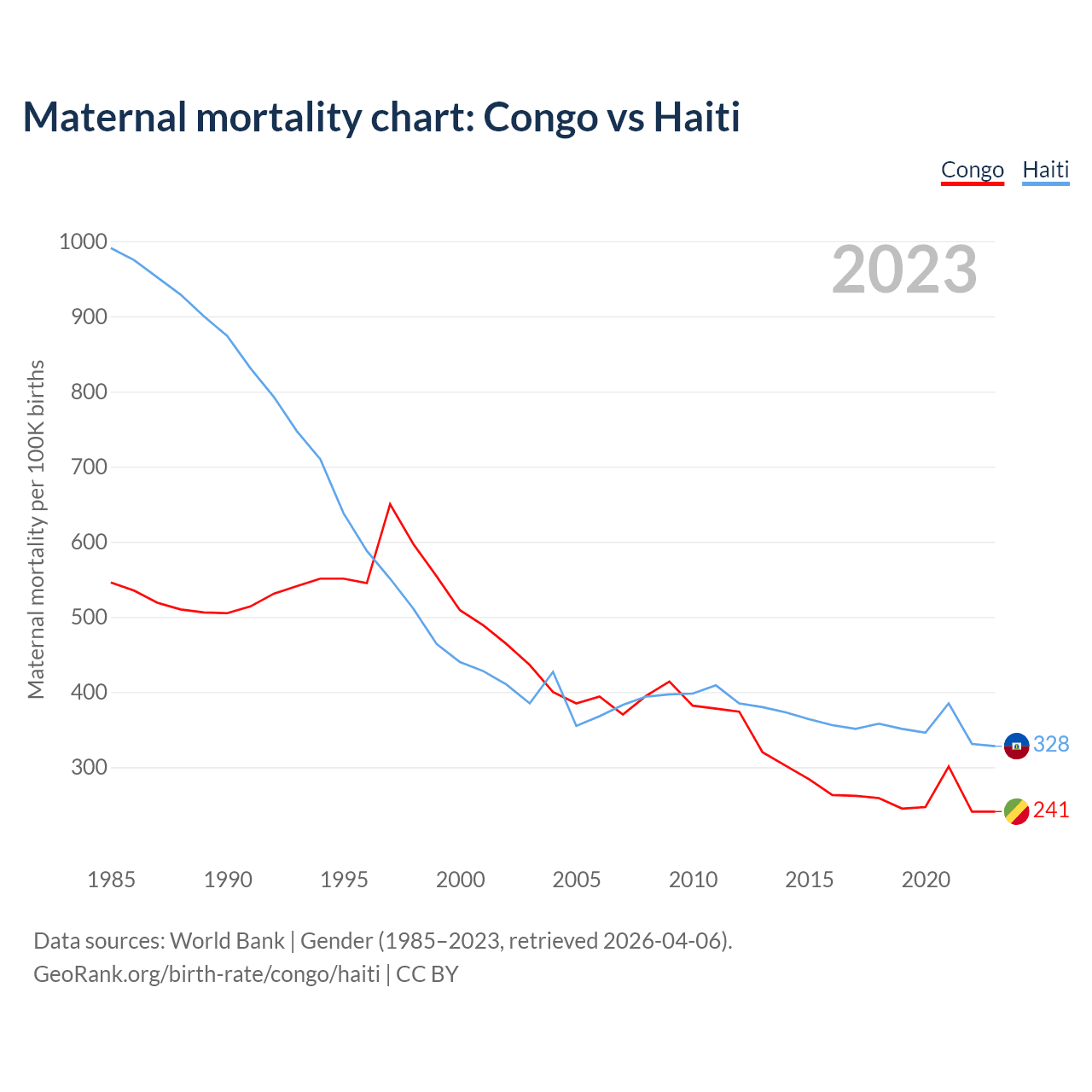 The maternal mortality rate, which is the probability of dying during childbirth or within 42 days of pregnancy termination, is 241 deaths per 100,000 live births in the Congo, compared to 328 deaths in Haiti.