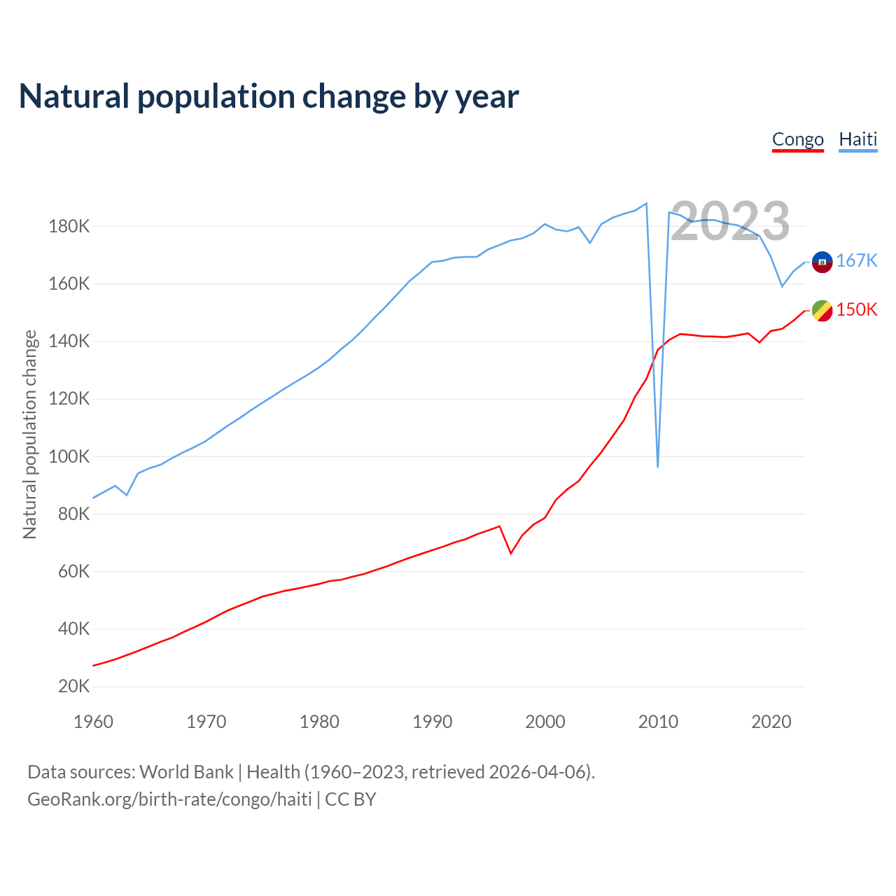 According to the latest available data on birth rates, the fertility rate in the Congo was 4.16 children per woman in 2023, compared to 2.66 in Haiti in 2023. The replacement level is considered to be 2.1 children per woman.