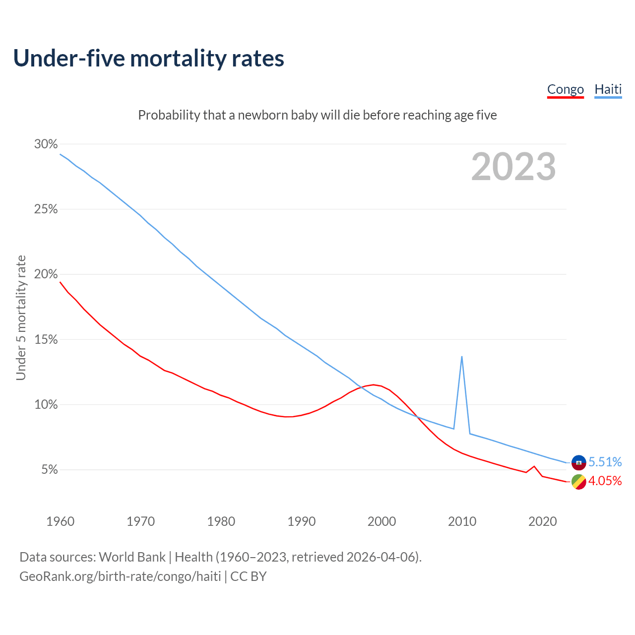 The chance that a newborn baby will die before reaching age five is 4.05% in the Congo and 5.51% in Haiti. Above is a chart with historical data on under-five mortality rates.