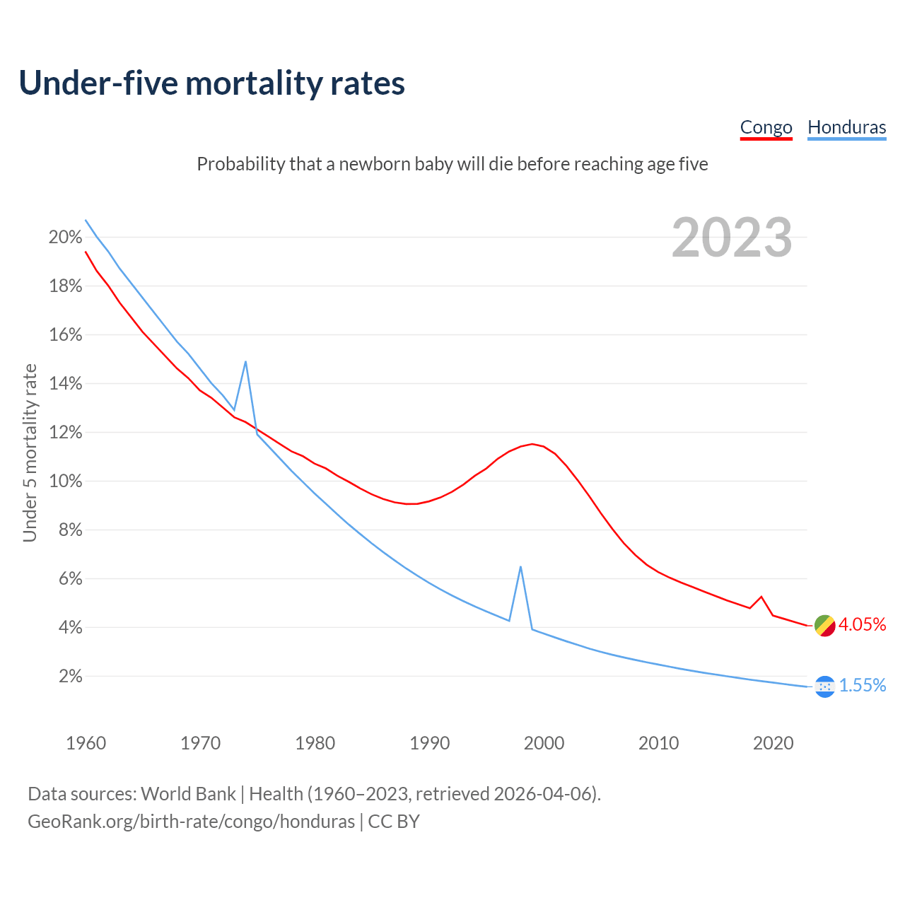 The chance that a newborn baby will die before reaching age five is 4.05% in the Congo and 1.55% in Honduras. Above is a chart with historical data on under-five mortality rates.