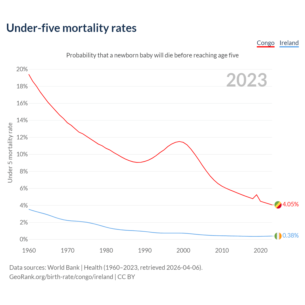 The chance that a newborn baby will die before reaching age five is 4.05% in the Congo and 0.38% in Ireland. Above is a chart with historical data on under-five mortality rates.