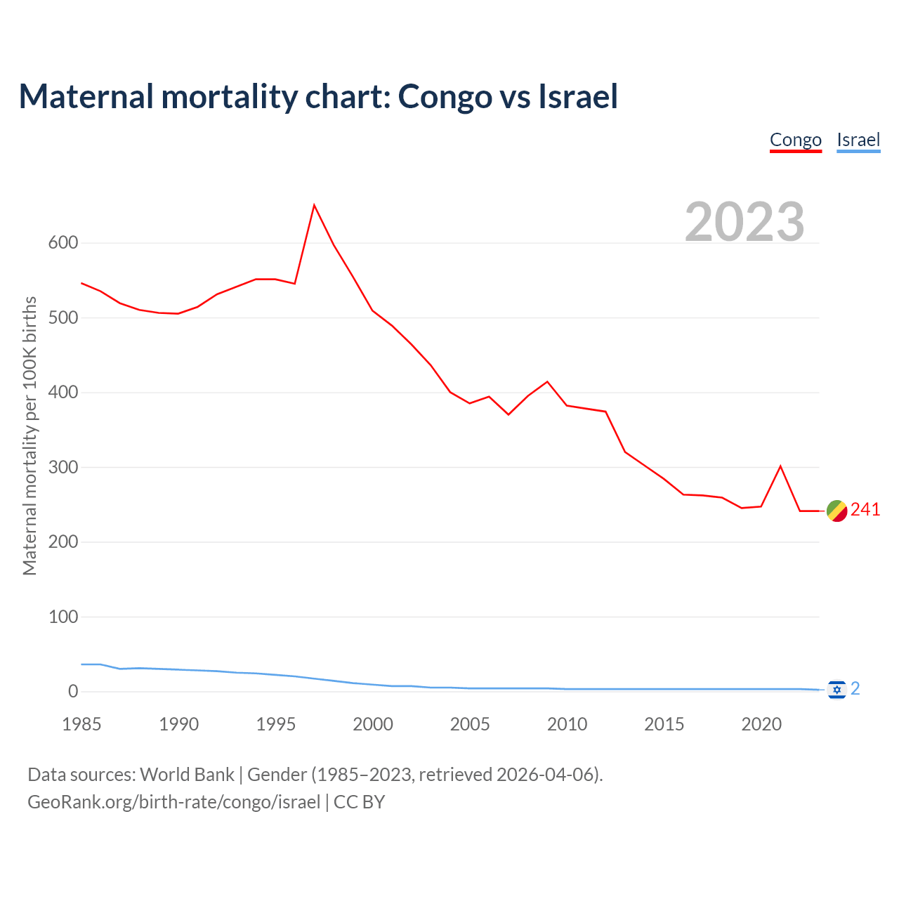 The maternal mortality rate, which is the probability of dying during childbirth or within 42 days of pregnancy termination, is 241 deaths per 100,000 live births in the Congo, compared to 2 deaths in Israel.
