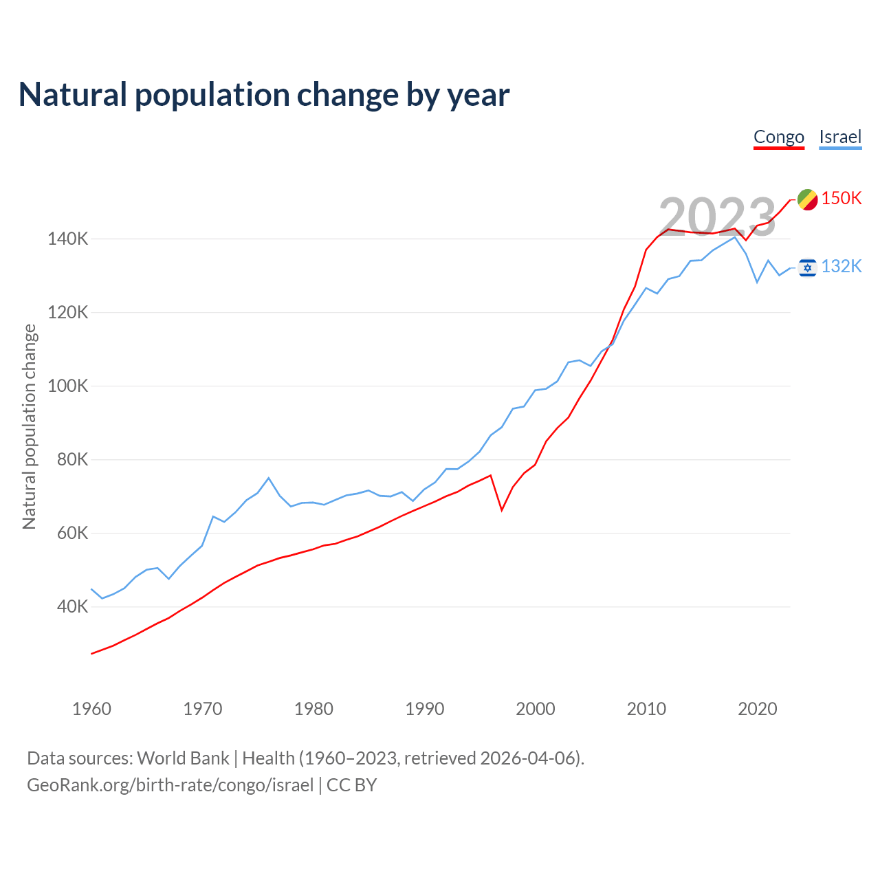 The Congo has an annual birth rate of 30.6 births per 1,000 people, compared to 18.6 for Israel. The average number of children a woman is expected to have during her lifetime — the fertility rate, is 4.16 in the Congo and 2.85 in Israel — 31.4% difference.