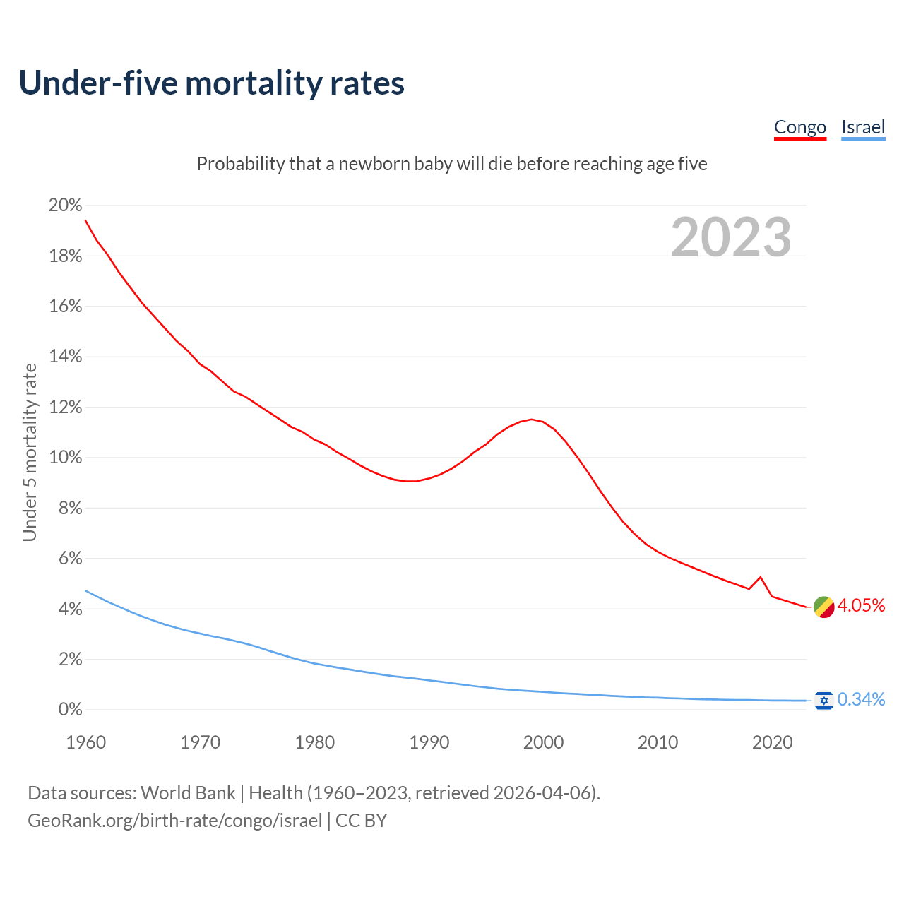 The chance that a newborn baby will die before reaching age five is 4.05% in the Congo and 0.34% in Israel. Above is a chart with historical data on under-five mortality rates.