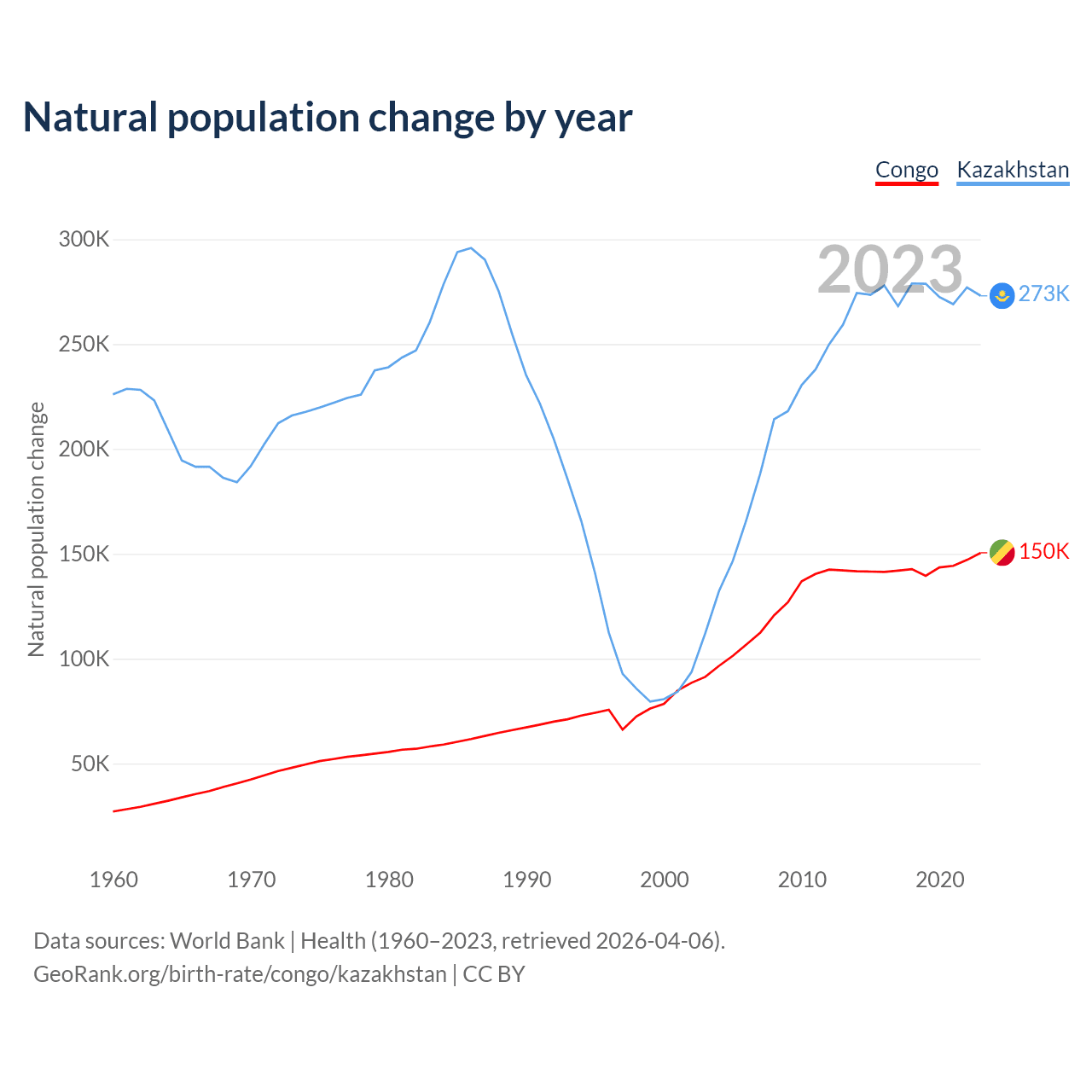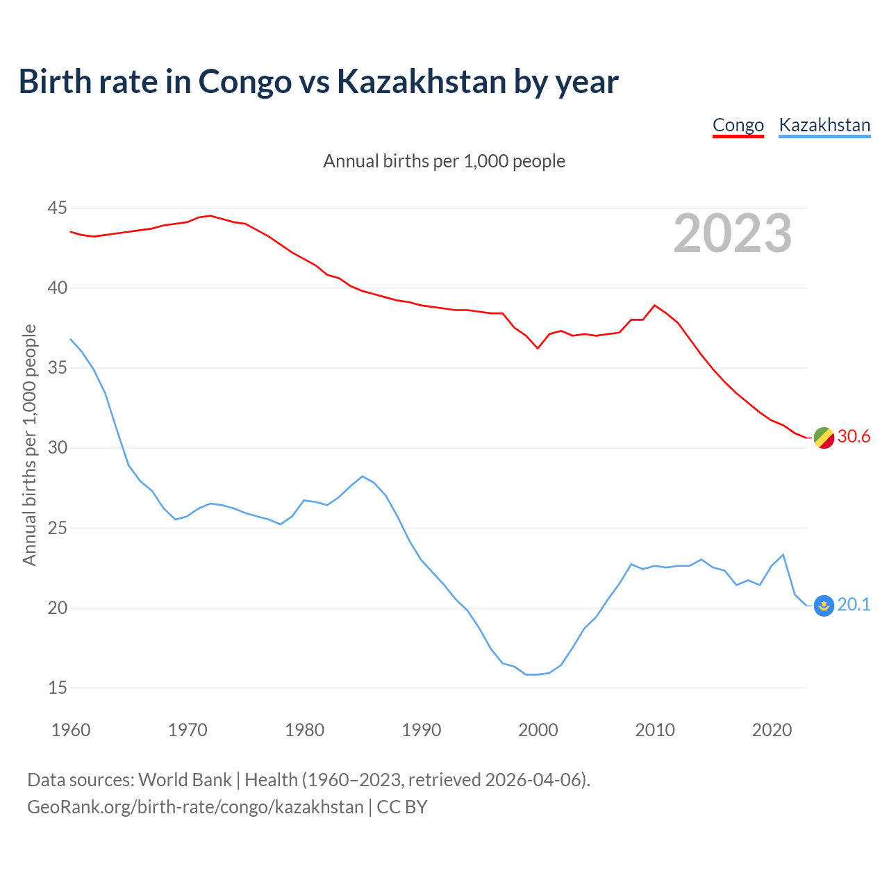 The Congo has an annual birth rate of 30.6 births per 1,000 people, compared to 20.1 for Kazakhstan. The average number of children a woman is expected to have during her lifetime — the fertility rate, is 4.16 in the Congo and 3.01 in Kazakhstan — 27.5% difference.