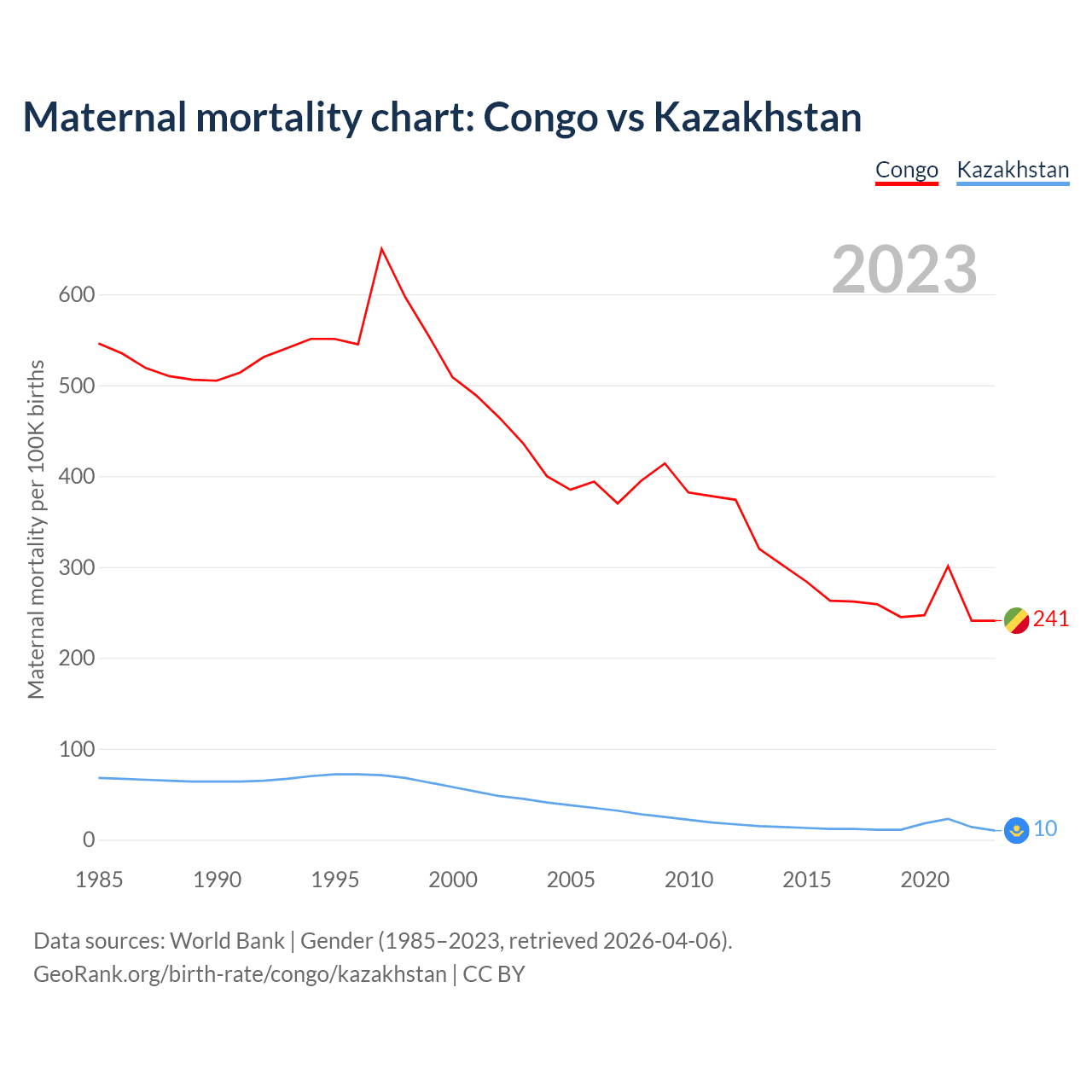 The maternal mortality rate, which is the probability of dying during childbirth or within 42 days of pregnancy termination, is 241 deaths per 100,000 live births in the Congo, compared to 10 deaths in Kazakhstan.