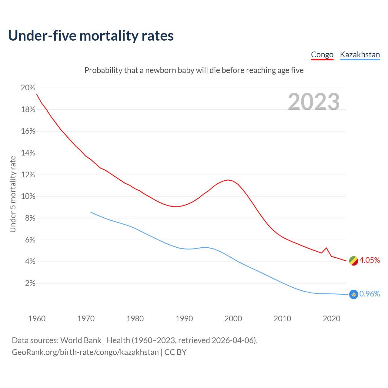 The chance that a newborn baby will die before reaching age five is 4.05% in the Congo and 0.96% in Kazakhstan. Above is a chart with historical data on under-five mortality rates.