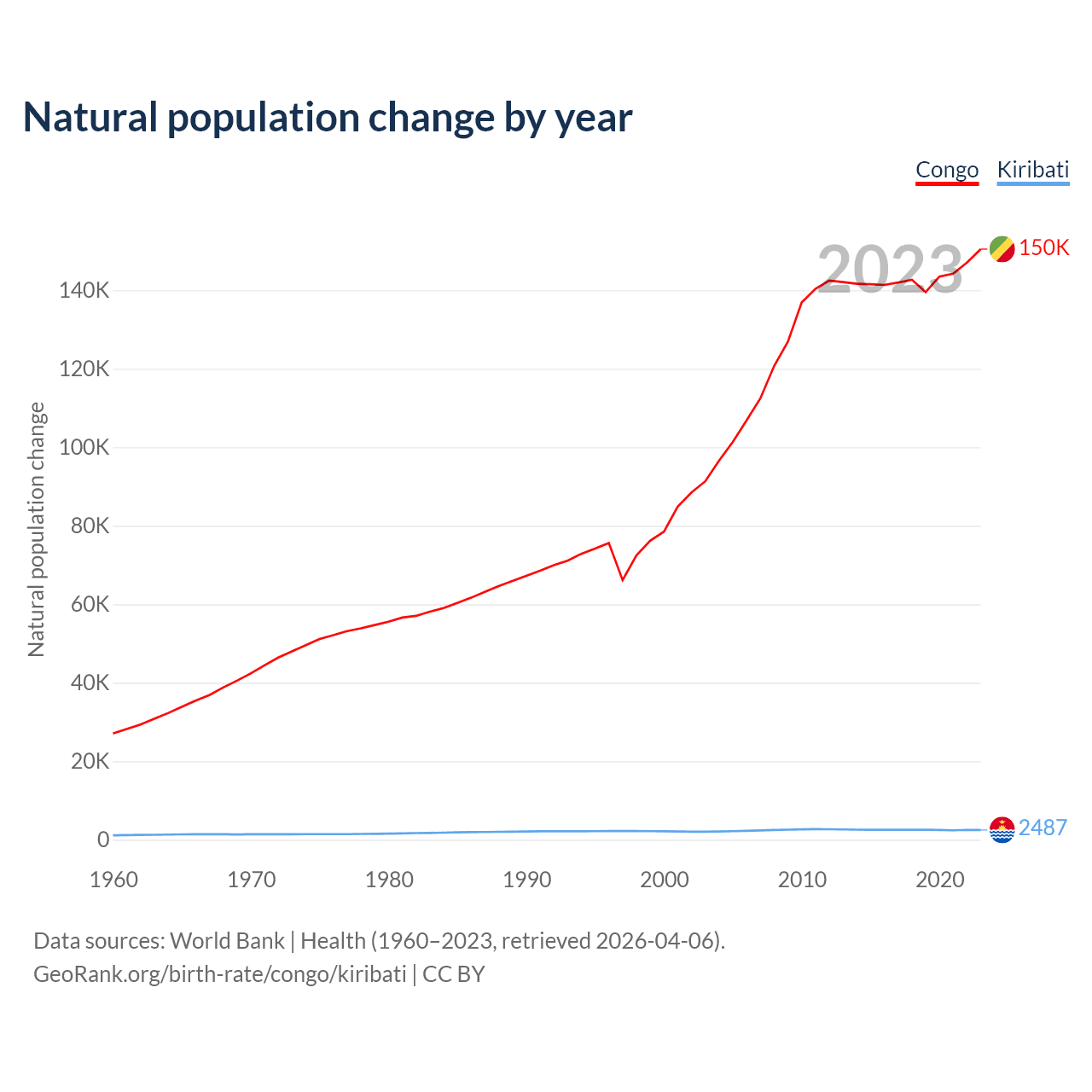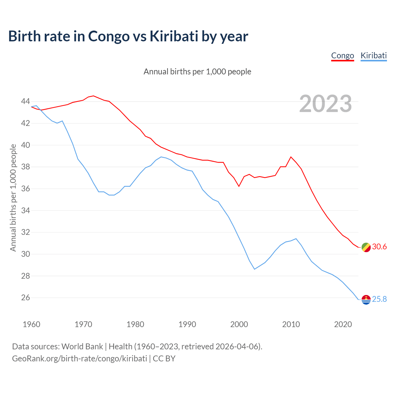 The Congo has an annual birth rate of 30.6 births per 1,000 people, compared to 25.8 for Kiribati. The average number of children a woman is expected to have during her lifetime — the fertility rate, is 4.16 in the Congo and 3.15 in Kiribati — 24.3% difference.