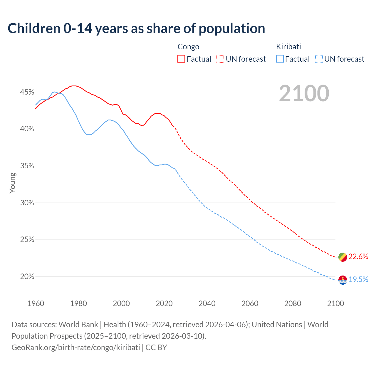 According to the latest available data on birth rates, the fertility rate in the Congo was 4.16 children per woman in 2023, compared to 3.15 in Kiribati in 2023. The replacement level is considered to be 2.1 children per woman.