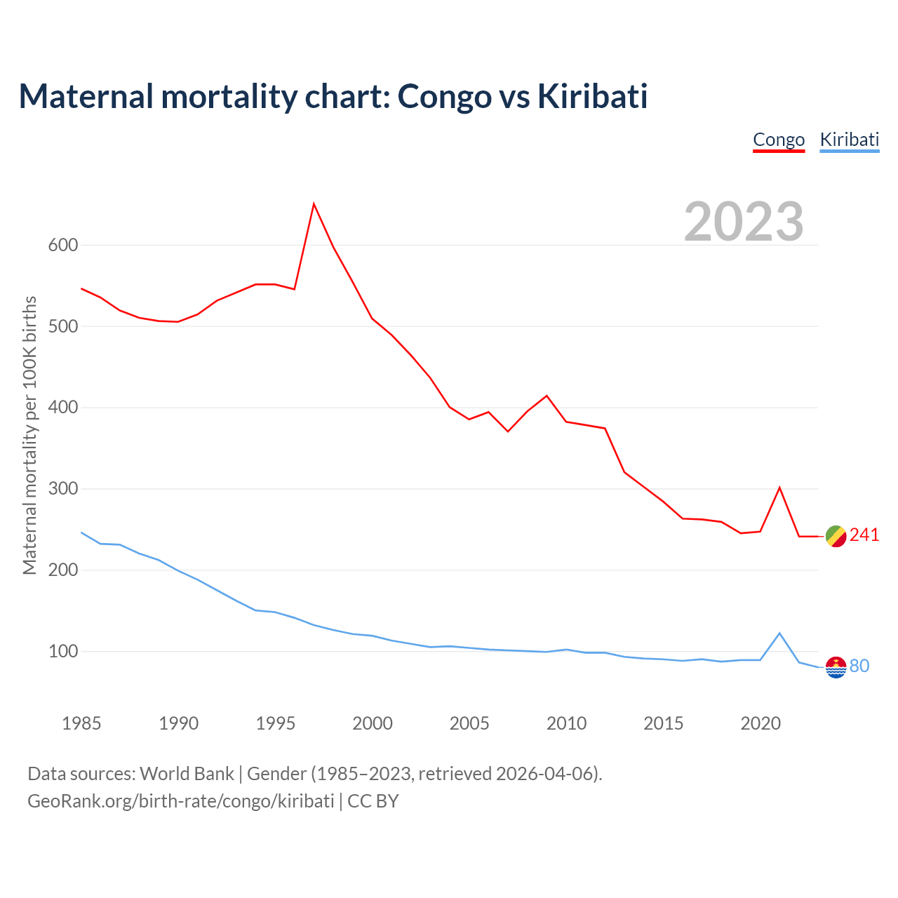 The maternal mortality rate, which is the probability of dying during childbirth or within 42 days of pregnancy termination, is 241 deaths per 100,000 live births in the Congo, compared to 80 deaths in Kiribati.