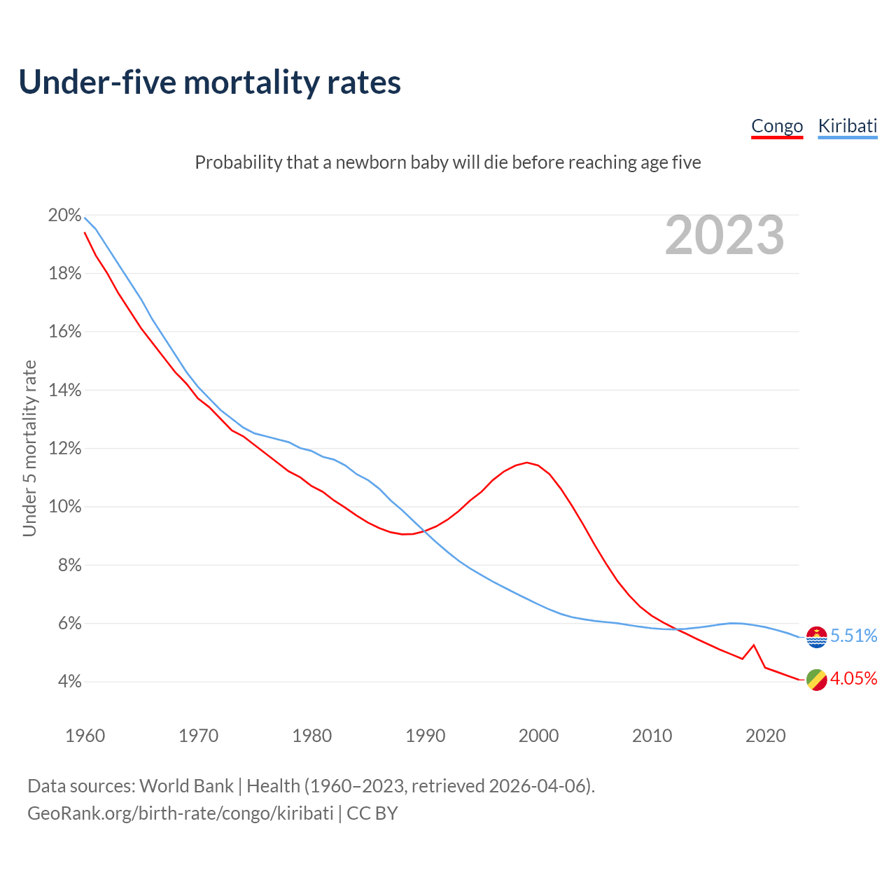 The chance that a newborn baby will die before reaching age five is 4.05% in the Congo and 5.51% in Kiribati. Above is a chart with historical data on under-five mortality rates.