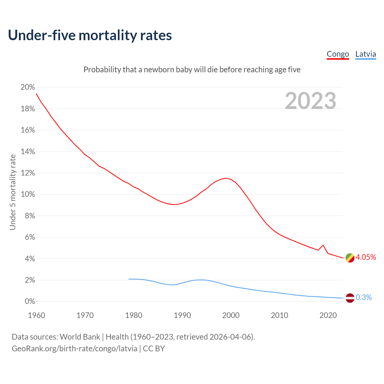 The chance that a newborn baby will die before reaching age five is 4.05% in the Congo and 0.3% in Latvia. Above is a chart with historical data on under-five mortality rates.