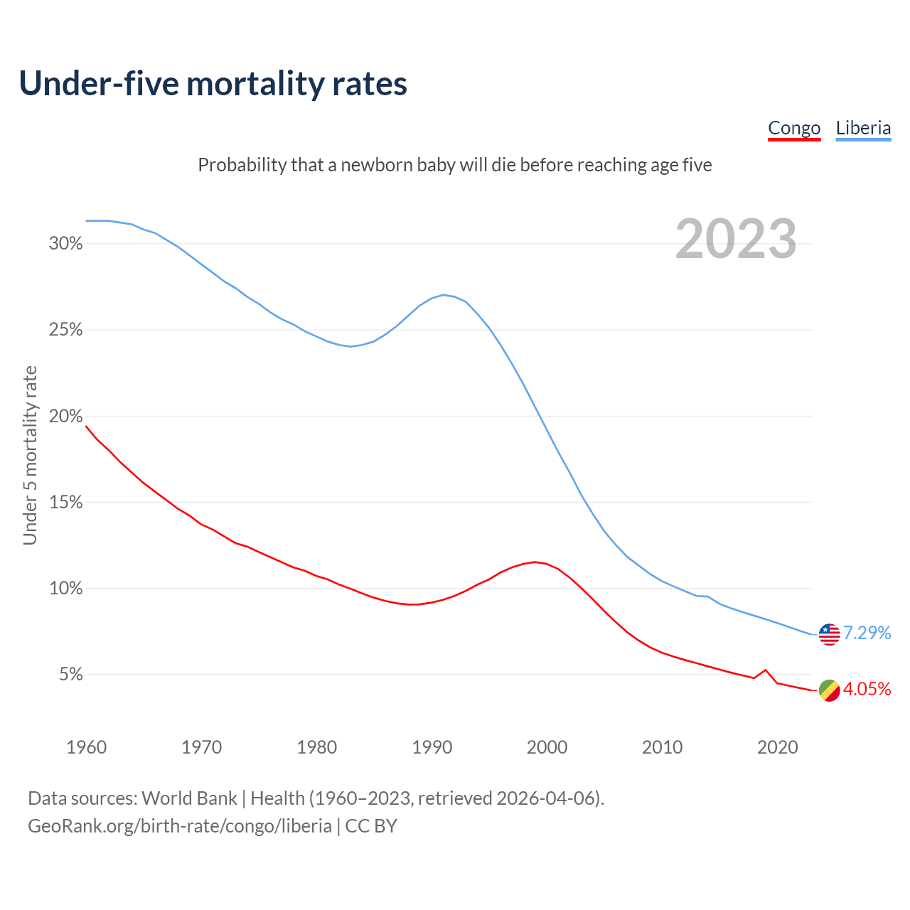 The chance that a newborn baby will die before reaching age five is 4.05% in the Congo and 7.29% in Liberia. Above is a chart with historical data on under-five mortality rates.