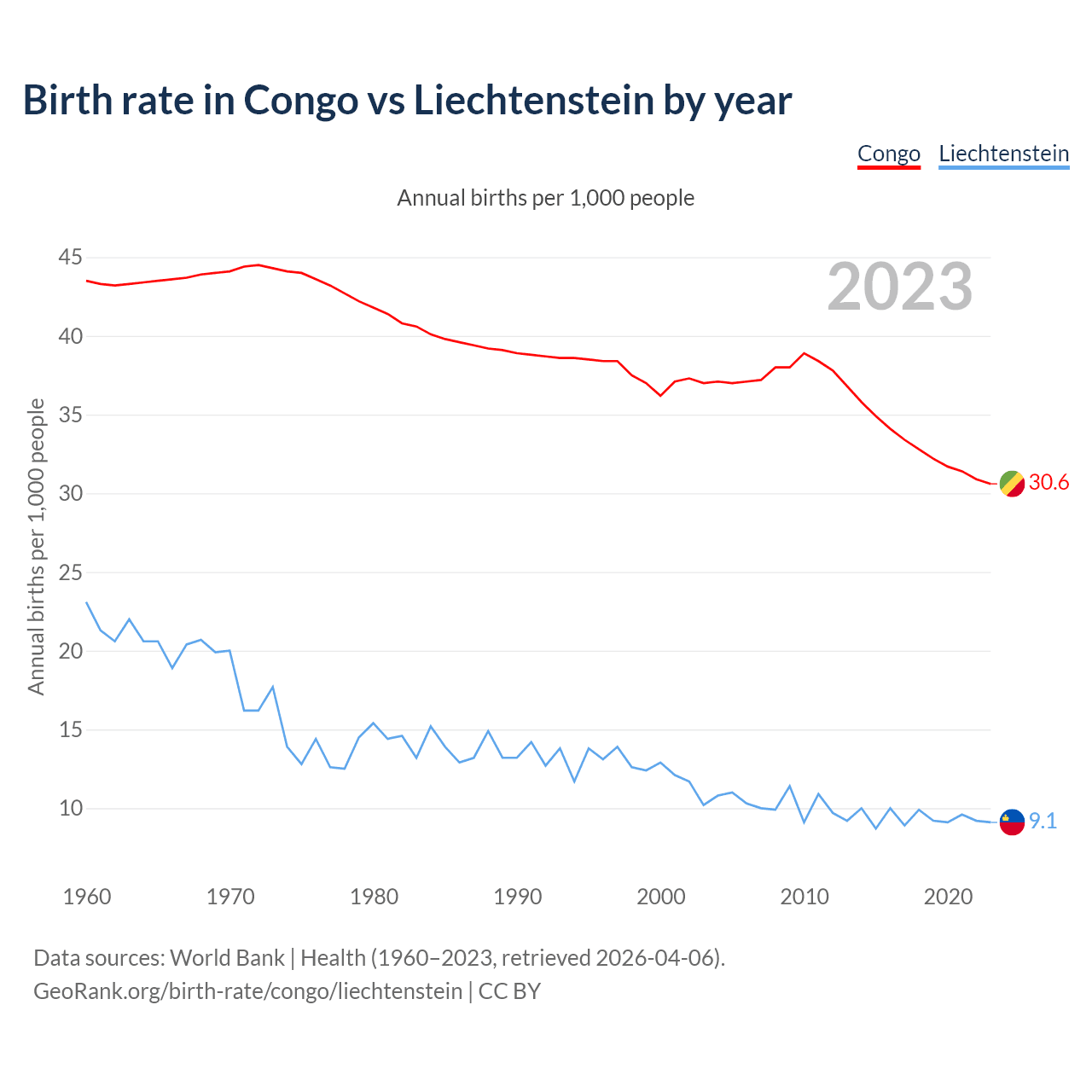 The Congo has an annual birth rate of 30.6 births per 1,000 people, compared to 9.1 for Liechtenstein. The average number of children a woman is expected to have during her lifetime — the fertility rate, is 4.16 in the Congo and 1.45 in Liechtenstein — 65.1% difference.