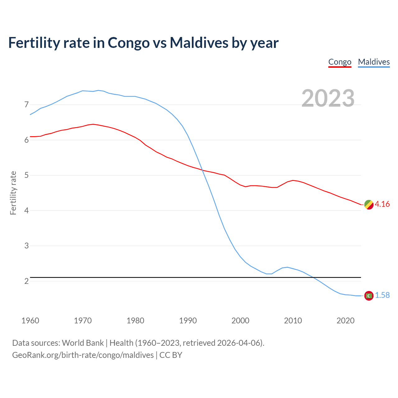 According to the latest available data on birth rates, the fertility rate in the Congo was 4.16 children per woman in 2023, compared to 1.58 in Maldives in 2023. The replacement level is considered to be 2.1 children per woman.