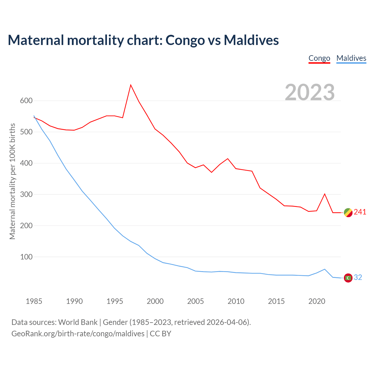 The maternal mortality rate, which is the probability of dying during childbirth or within 42 days of pregnancy termination, is 241 deaths per 100,000 live births in the Congo, compared to 32 deaths in Maldives.