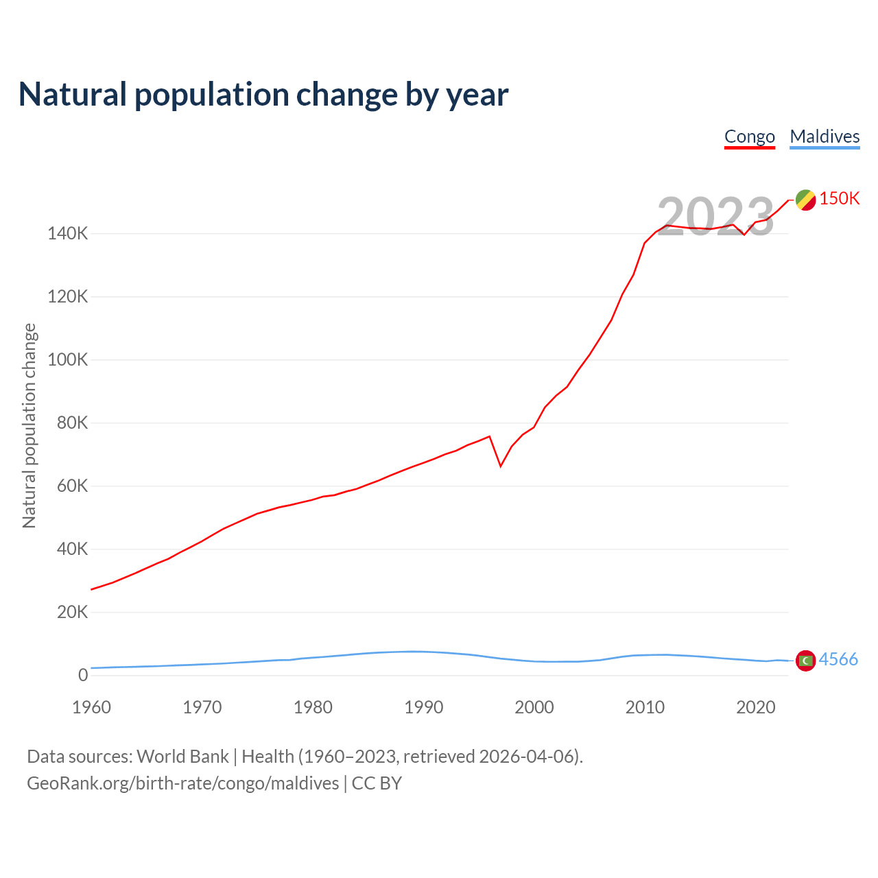 The Congo has an annual birth rate of 30.6 births per 1,000 people, compared to 11 for Maldives. The average number of children a woman is expected to have during her lifetime — the fertility rate, is 4.16 in the Congo and 1.58 in Maldives — 62.1% difference.