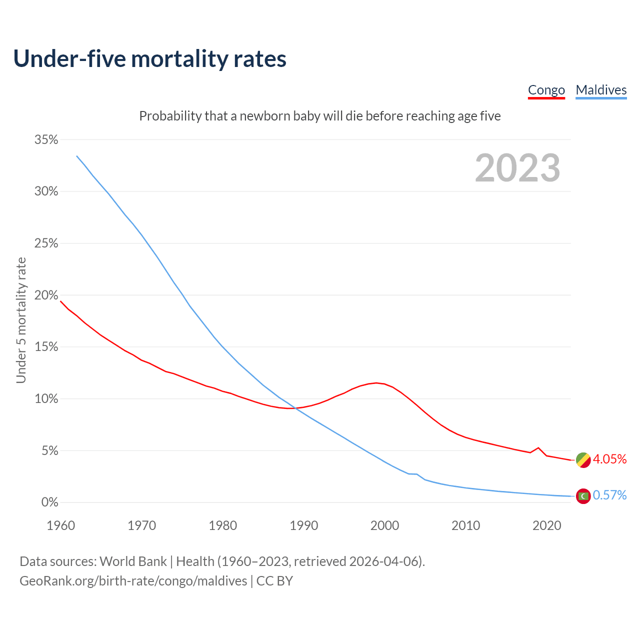 The chance that a newborn baby will die before reaching age five is 4.05% in the Congo and 0.57% in Maldives. Above is a chart with historical data on under-five mortality rates.