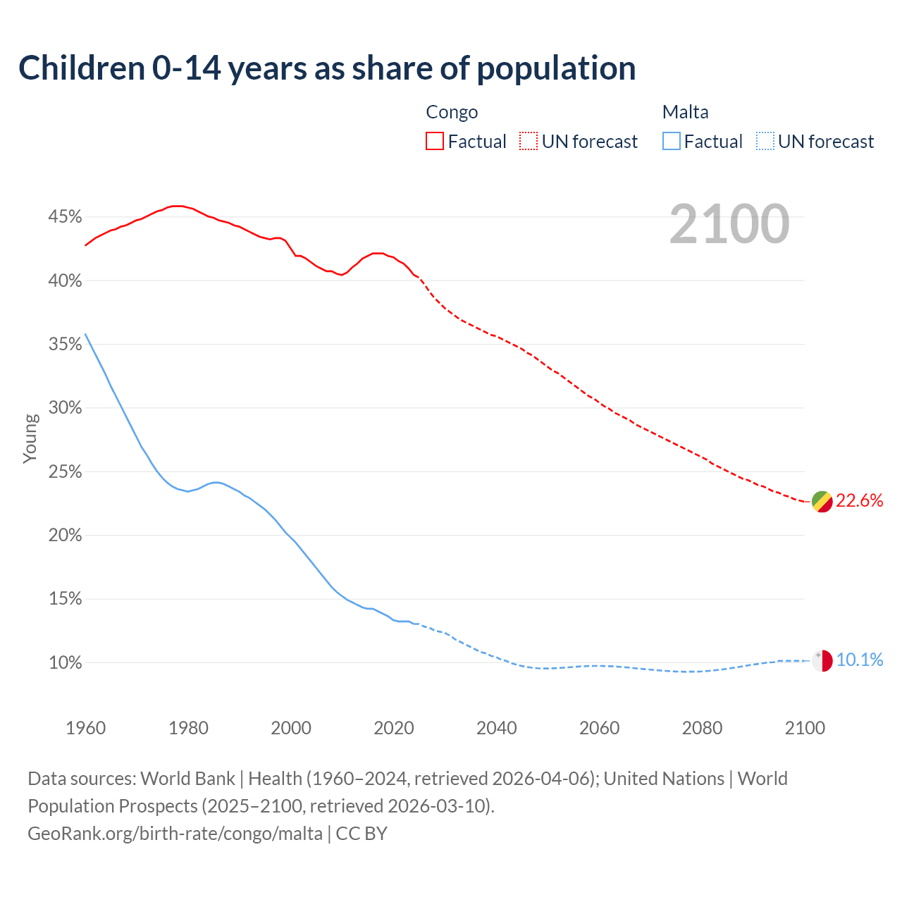 According to the latest available data on birth rates, the fertility rate in the Congo was 4.16 children per woman in 2023, compared to 1.06 in Malta in 2023. The replacement level is considered to be 2.1 children per woman.