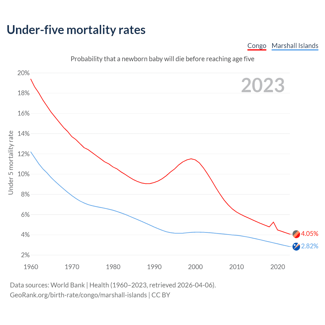The chance that a newborn baby will die before reaching age five is 4.05% in the Congo and 2.82% in the Marshall Islands. Above is a chart with historical data on under-five mortality rates.