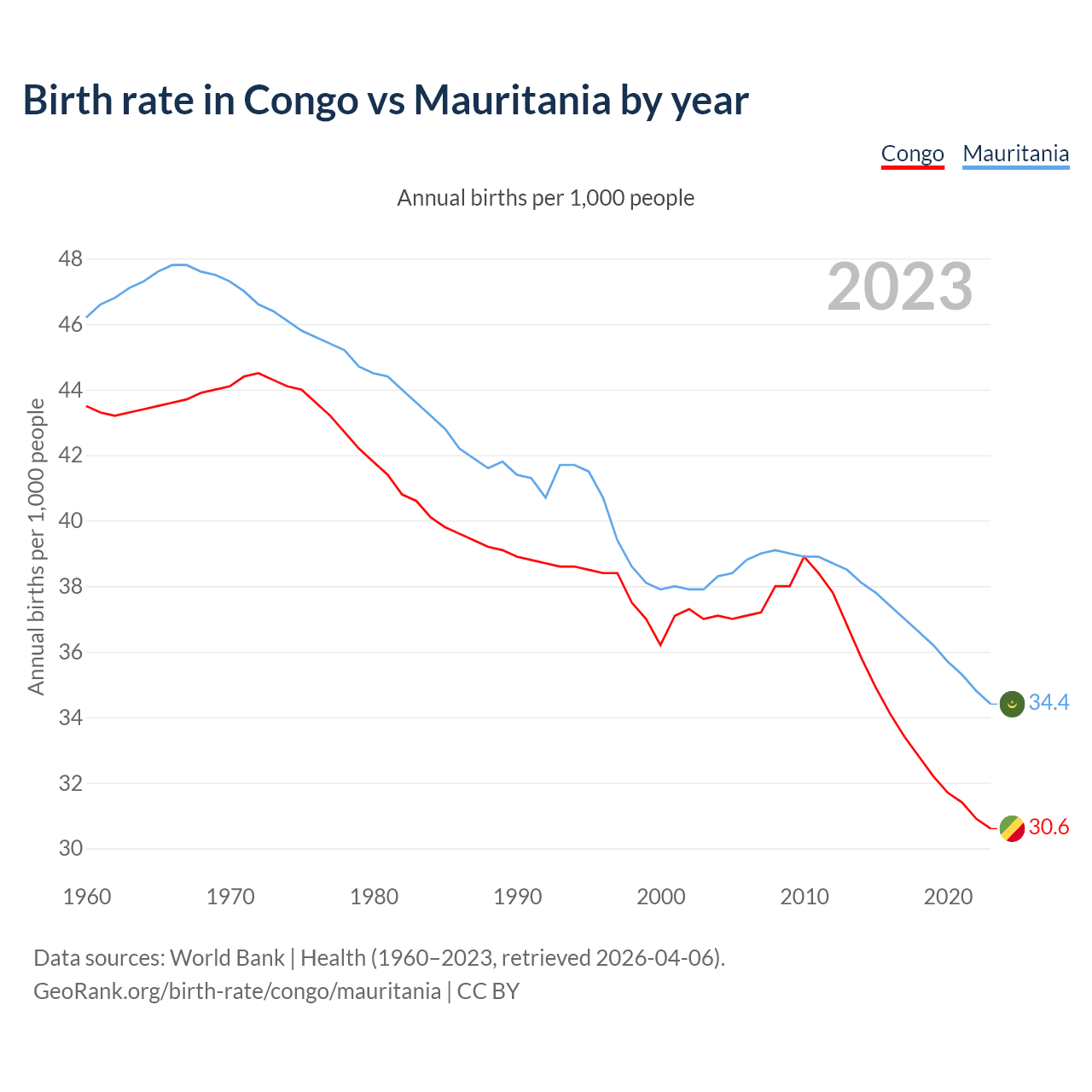 The Congo has an annual birth rate of 30.6 births per 1,000 people, compared to 34.4 for Mauritania. The average number of children a woman is expected to have during her lifetime — the fertility rate, is 4.16 in the Congo and 4.7 in Mauritania — 13% difference.