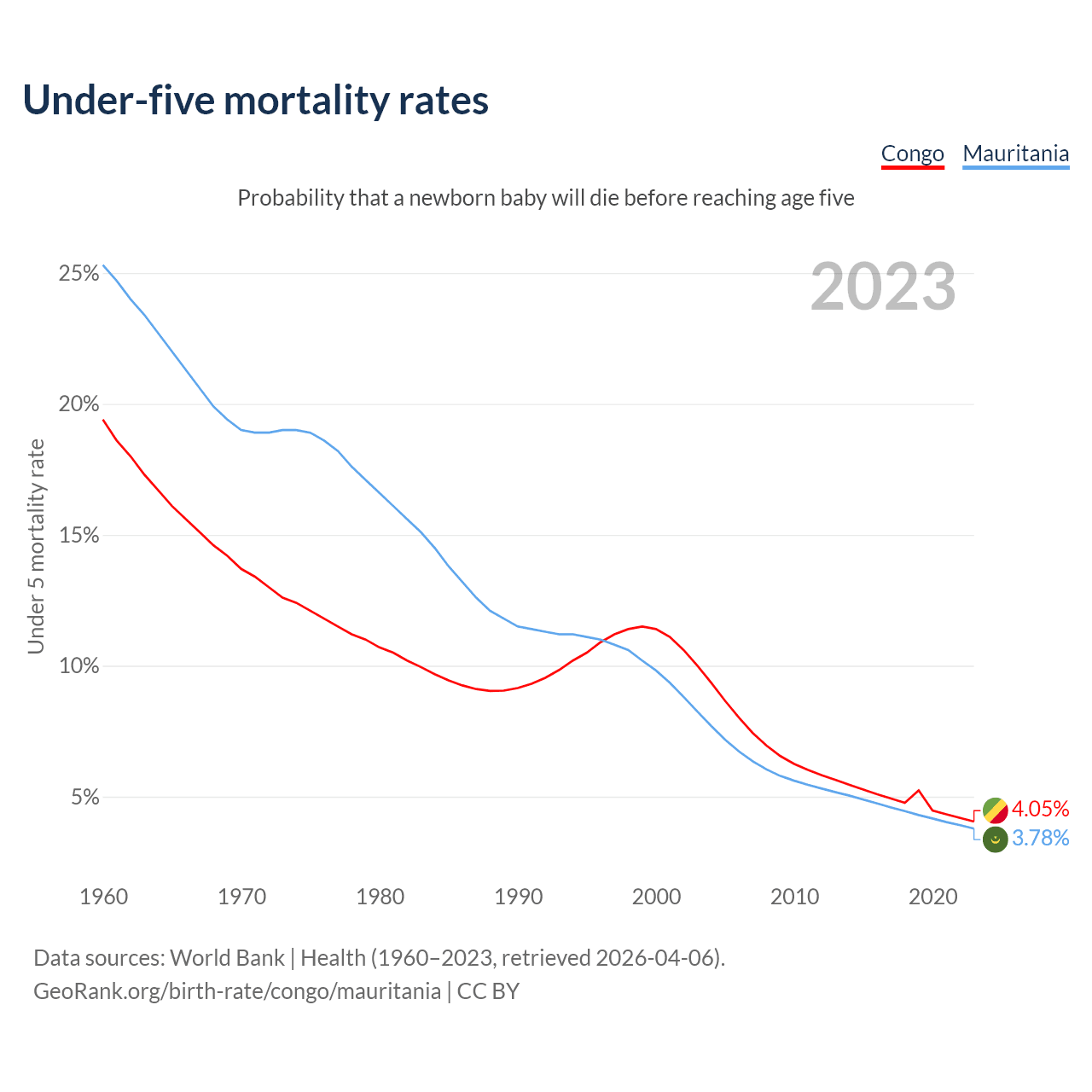 The chance that a newborn baby will die before reaching age five is 4.05% in the Congo and 3.78% in Mauritania. Above is a chart with historical data on under-five mortality rates.