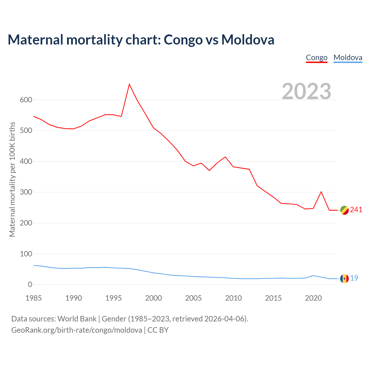 The maternal mortality rate, which is the probability of dying during childbirth or within 42 days of pregnancy termination, is 241 deaths per 100,000 live births in the Congo, compared to 19 deaths in Moldova.